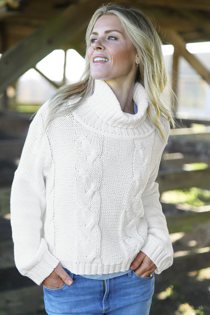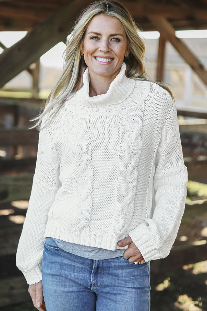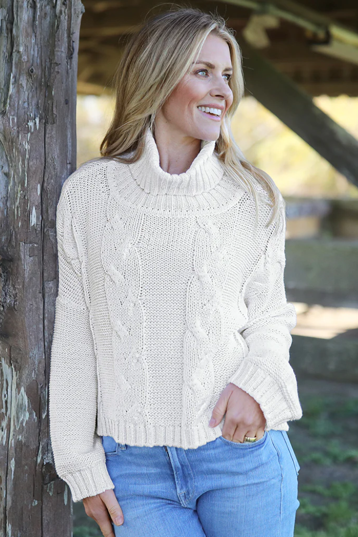 This incredibly soft and breathable knit features a cable knit pattern throughout the body. Details including ribbed T neck, cuffs and hem make this warm & cozy relaxed fit style with dropped shoulders a fall favorite.