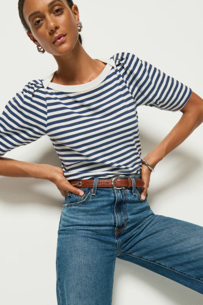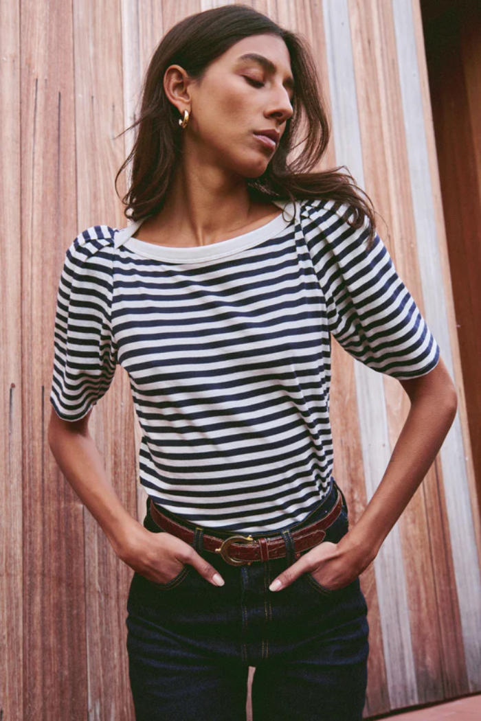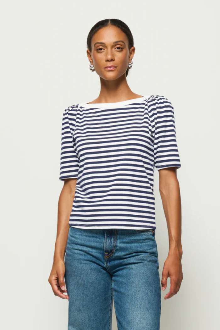 French girl chic meets an effortless classic. This organic cotton tee features an envelope neckline, contrast ribbing, and pleated shoulder pads to kick it up a notch. This one comes in Country Stripe.