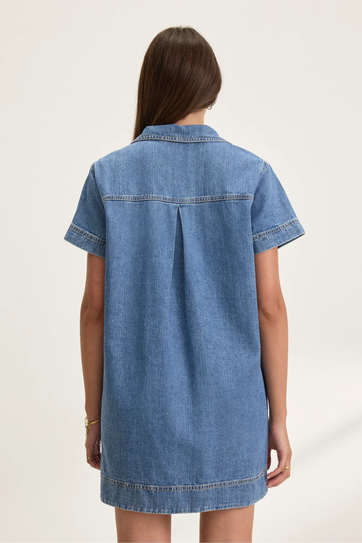 This denim mini dress blends effortless style with practicality, featuring a V-neckline, collar, short sleeves, and two front patch pockets. A rear pleat enhances movement for a relaxed yet polished look.