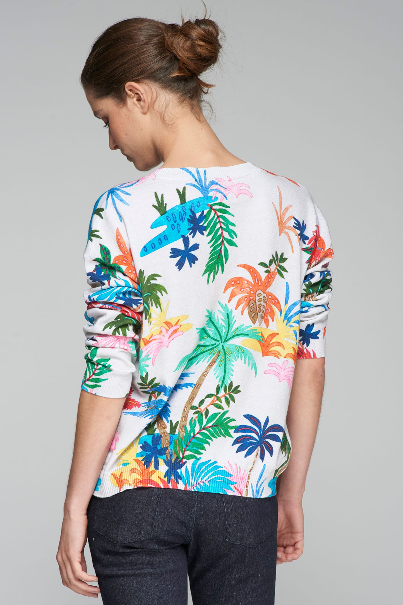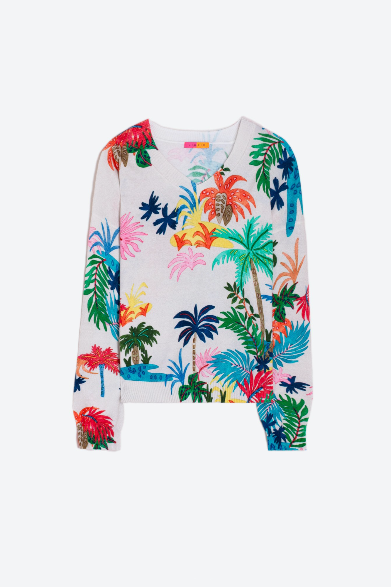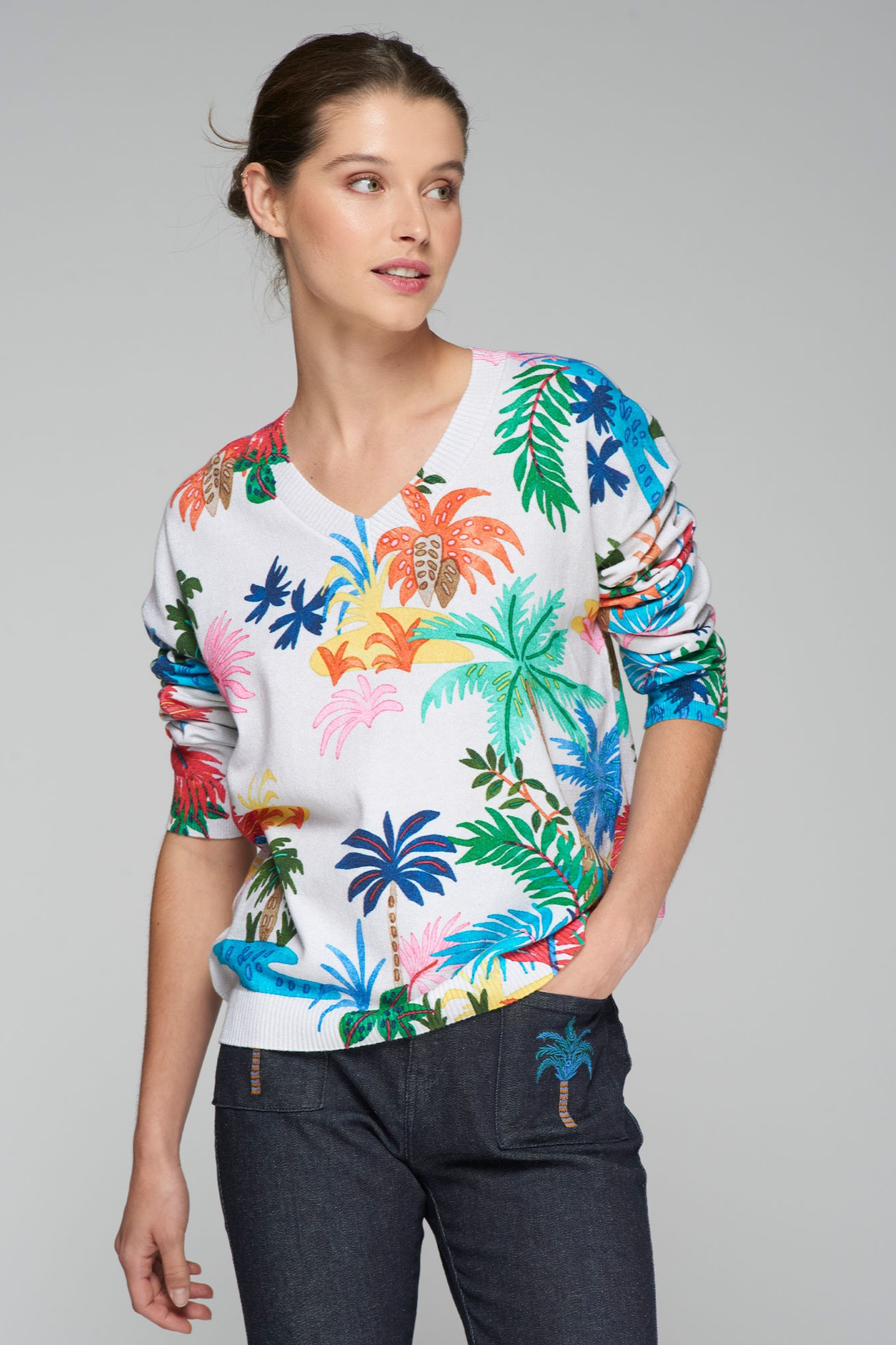 Printed jumper with coloured palm trees. V-neck. 100% cotton. The model is 1.72 m tall and wears size S.