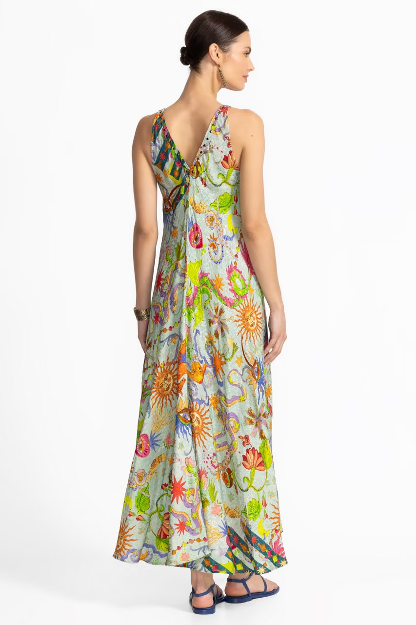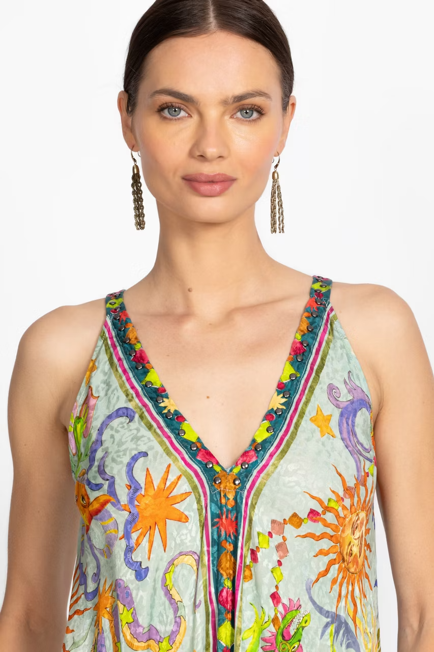 Embellished with a bold pattern featuring vibrant color and unique iconography, the Eva Dress is crafted from a lightweight flowing fabric. Designed with a V-neckline adorned with eye-catching rivets along the neckband, this sleeveless dress is finished with a contrasting trim at the neckline and center. Pair with bold jewelry pieces and strappy heels for an evening out with friends.