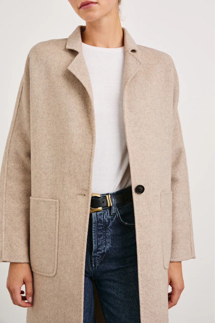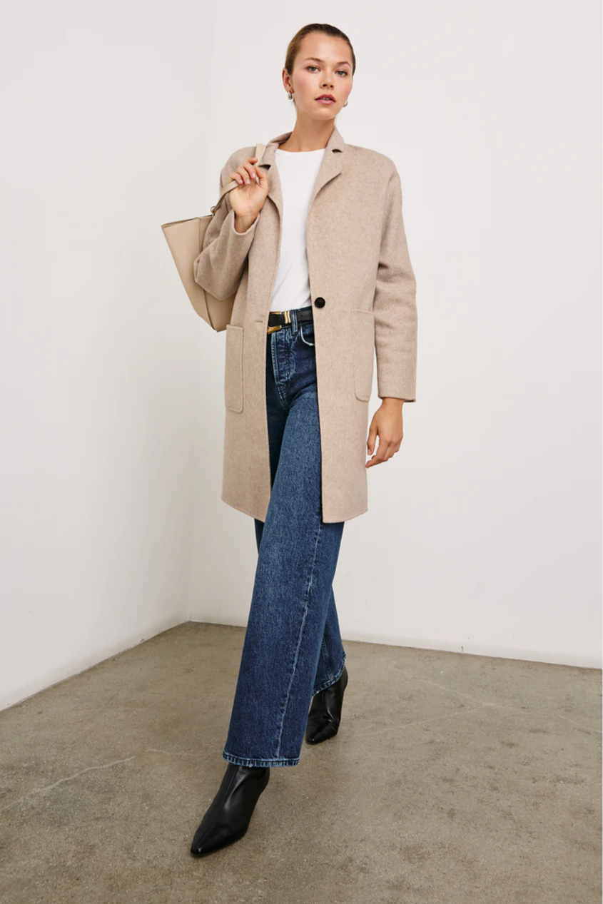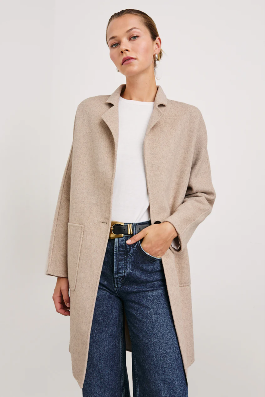 This luxe coat by Rails is the perfect third piece sure to elevate any outfit. Made from a heavyweight wool blend, this unlined coat features a slightly oversized fit, notched lapels, dolman sleeves, oversized patch pockets at hip, and a single-button front closure with horn button.