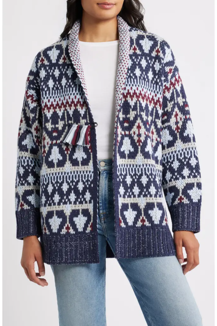 Keep your look as cozy as can be with this shawl-collar knit coat featuring a classic Fair Isle motif.