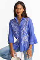 Crafted from a lightweight flowing fabric, the Roberta 3/4 Flounce Sleeve Shirt is vibrant and unique. Featuring a classic button-front bordered with eye-catching decorative embroidery, this stunning blouse is finished with tiered bell sleeves for dramatic flair. Pair with dark wash denim and coordinating flats for a polished weekend look.