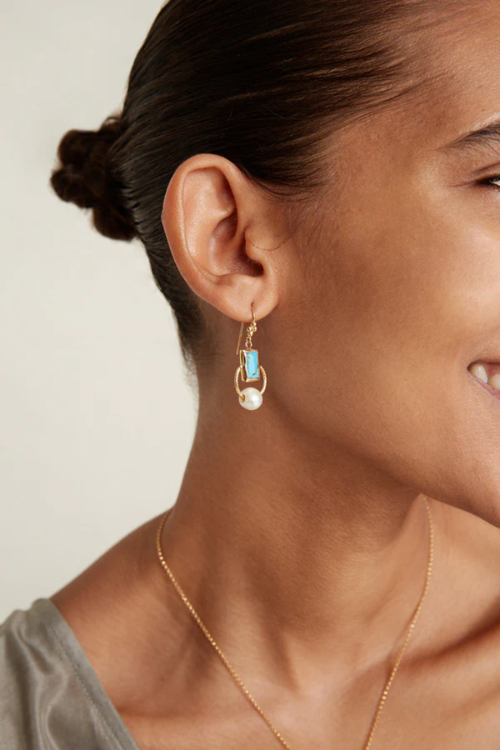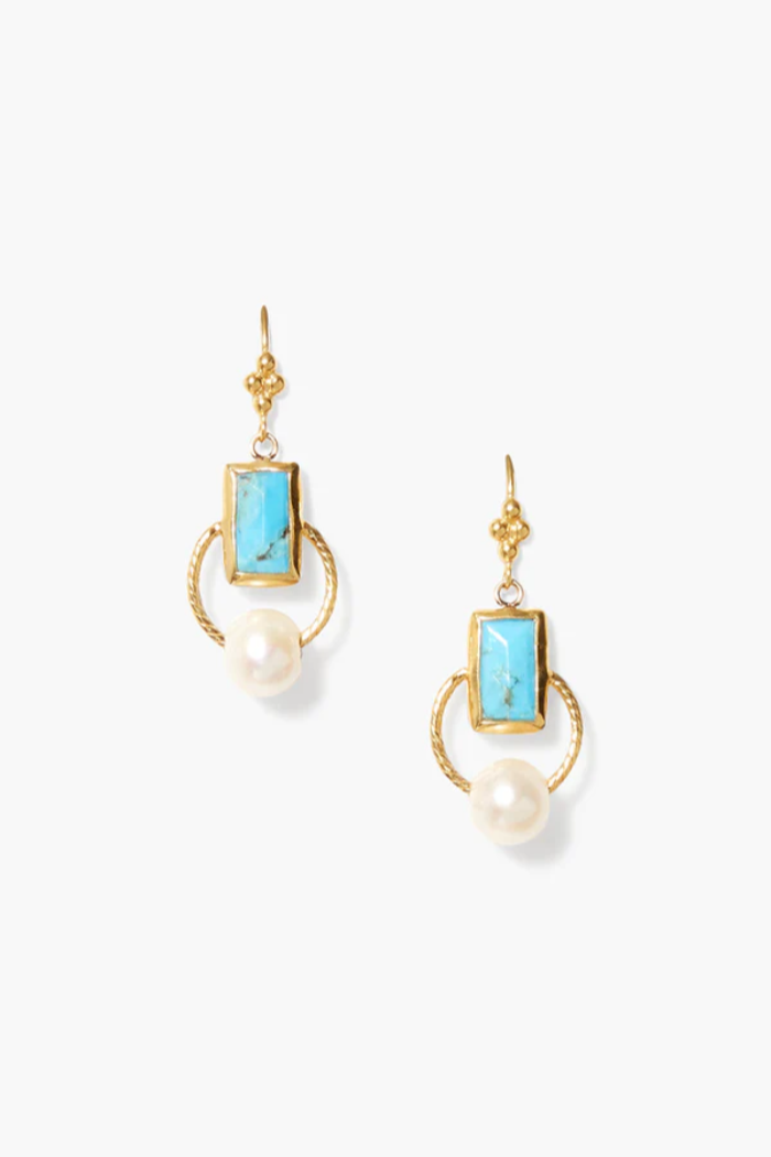 These elegant drop earrings feature a bezel wrapped turquoise pendant and white freshwater pearl on gold rings.