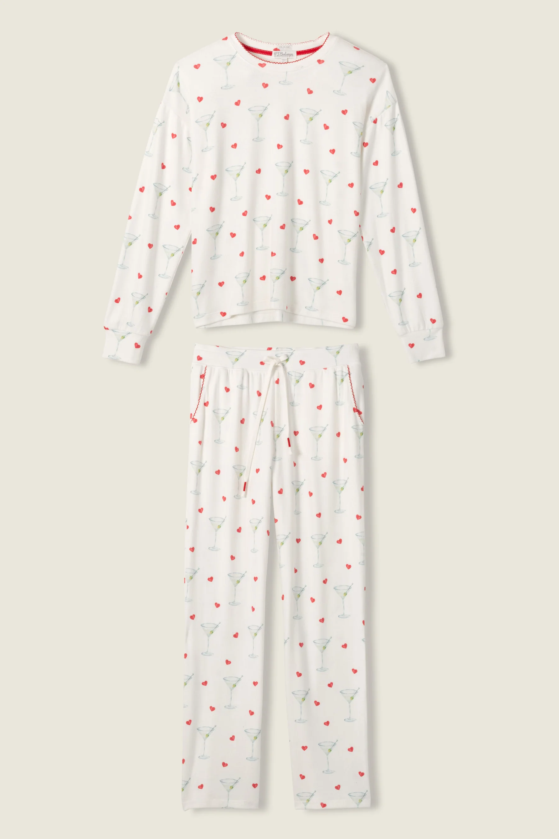 Cheers to the season in classic ivory lounge set, featuring a comfortable long sleeve top and matching pants, both adorned with a charming martini glass pattern that brings a festive flair. The playful design adds a touch of fun to your loungewear—cheers to stylish comfort and festive vibes!