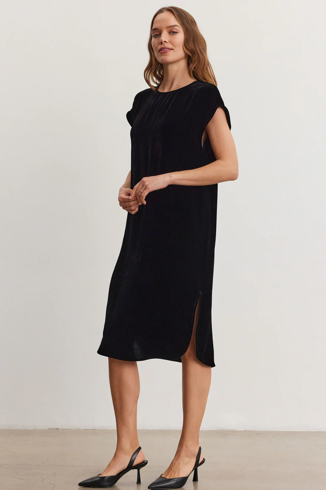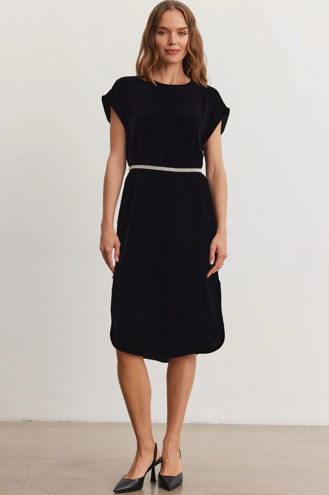 Elevate your wardrobe with Velvet by Graham & Spencer's luxurious silk velvet dress, featuring a mid-length cut and short sleeves for a perfect balance of elegance and comfort. Crafted from sumptuous silk velvet, this dress offers a soft, rich texture that drapes beautifully, creating a flattering silhouette. Come with detachable rhinestone belt.