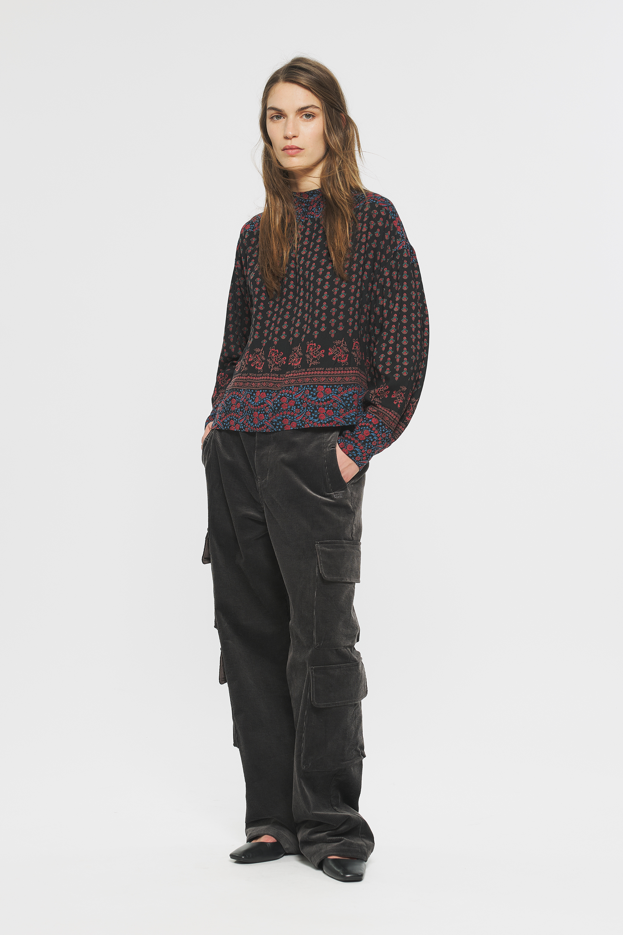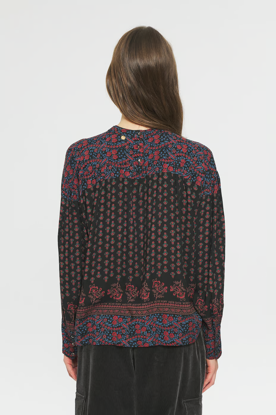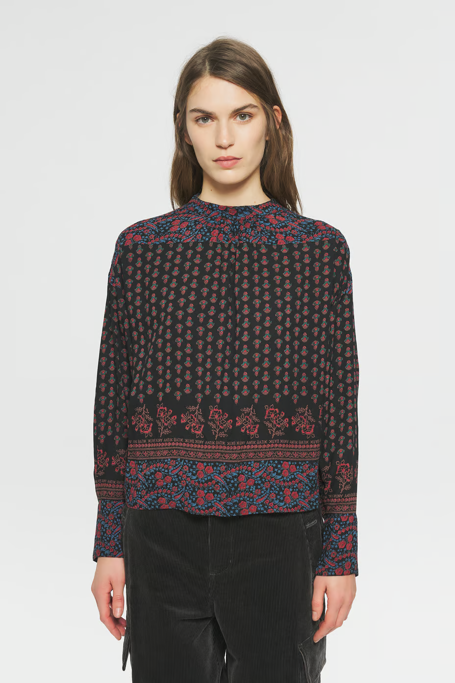 Viscose print blouse. Button tab on the front and wrists. Natural mother-of-pearl buttons.