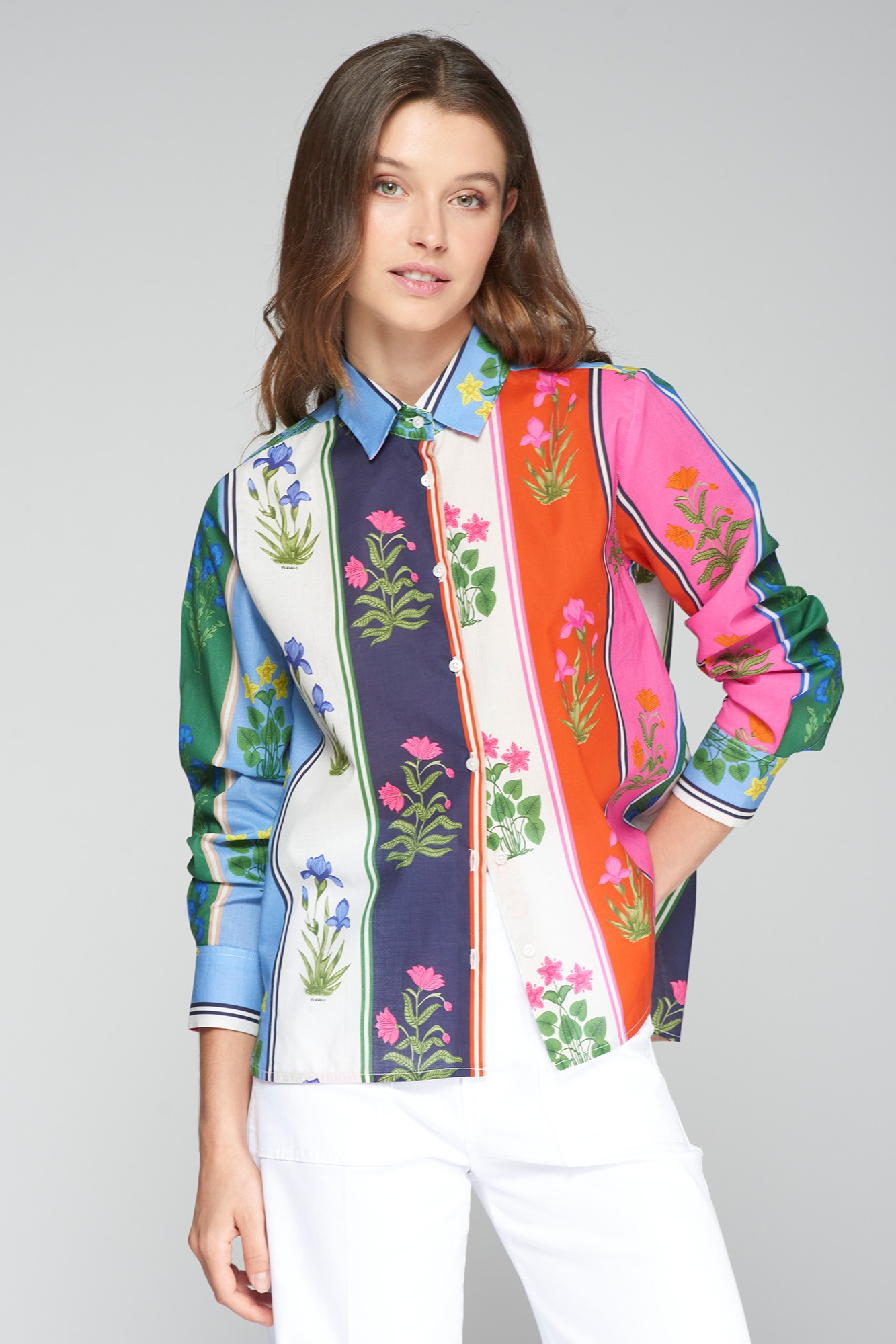 Shirt with coloured vertical stripes and printed flowers. Front fastening with shirt buttons. Long sleeves with cuffs. 100% cotton. The model is 1.72 m tall and wears size 38.