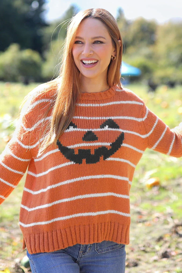 The missing piece in your autumn wardrobe — perfect for all Fall lovers! This must-have striped boyfriend sweater is crafted from our super soft wool blend with a relaxed, flattering fit that keeps you cozy all season long. The Jack-O-Lantern graphic is knit directly into the center front, adding a festive touch. Finished with ribbed crewneck, cuffs, and hem, plus small side slits for extra comfort and ease of movement.