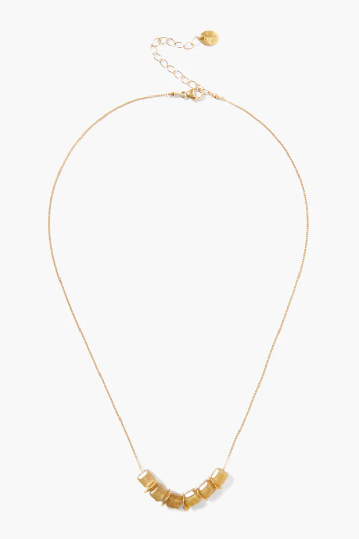 This stunning necklace features a row of faceted yellow apatite cubes and gold discs on a delicate gold chain.