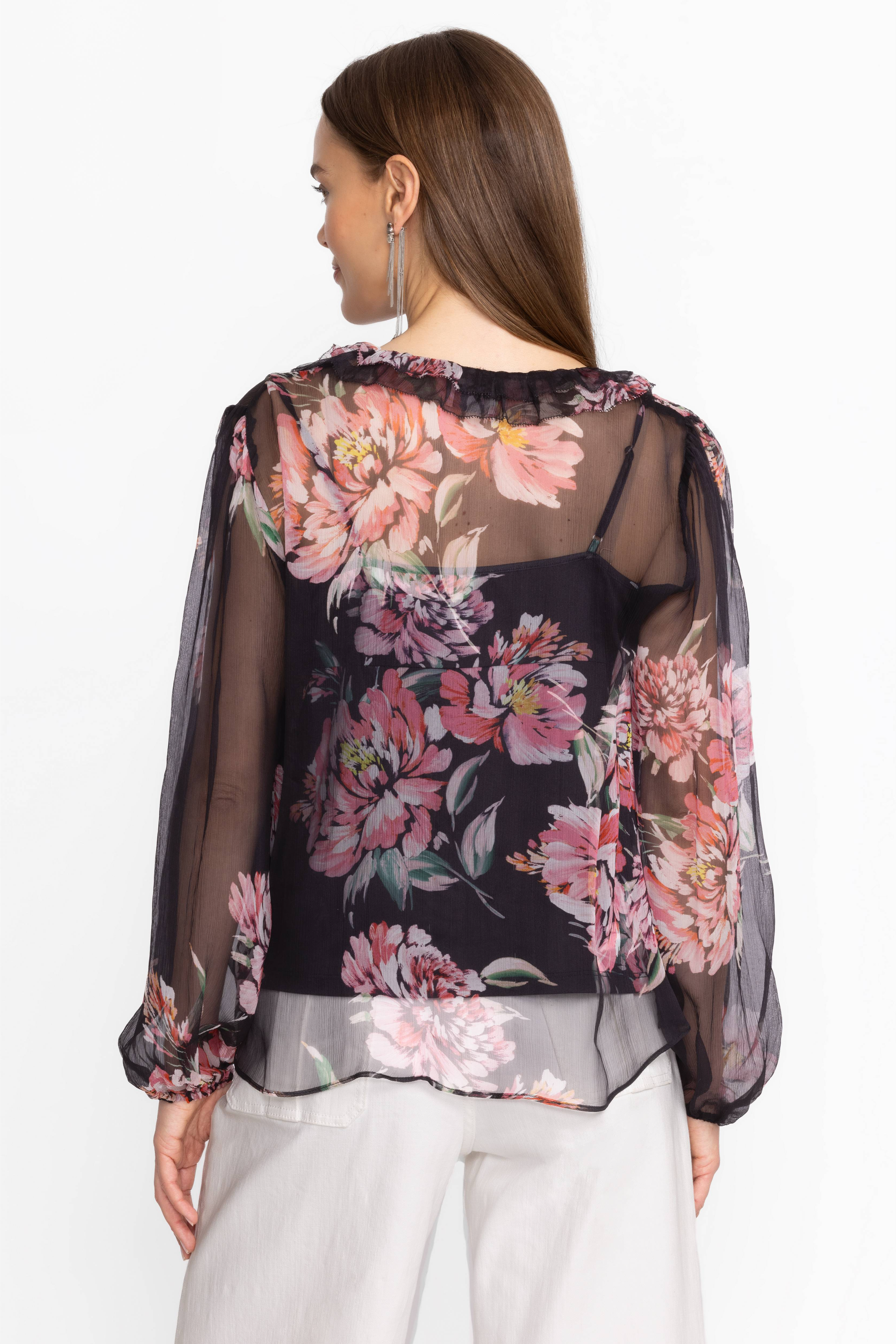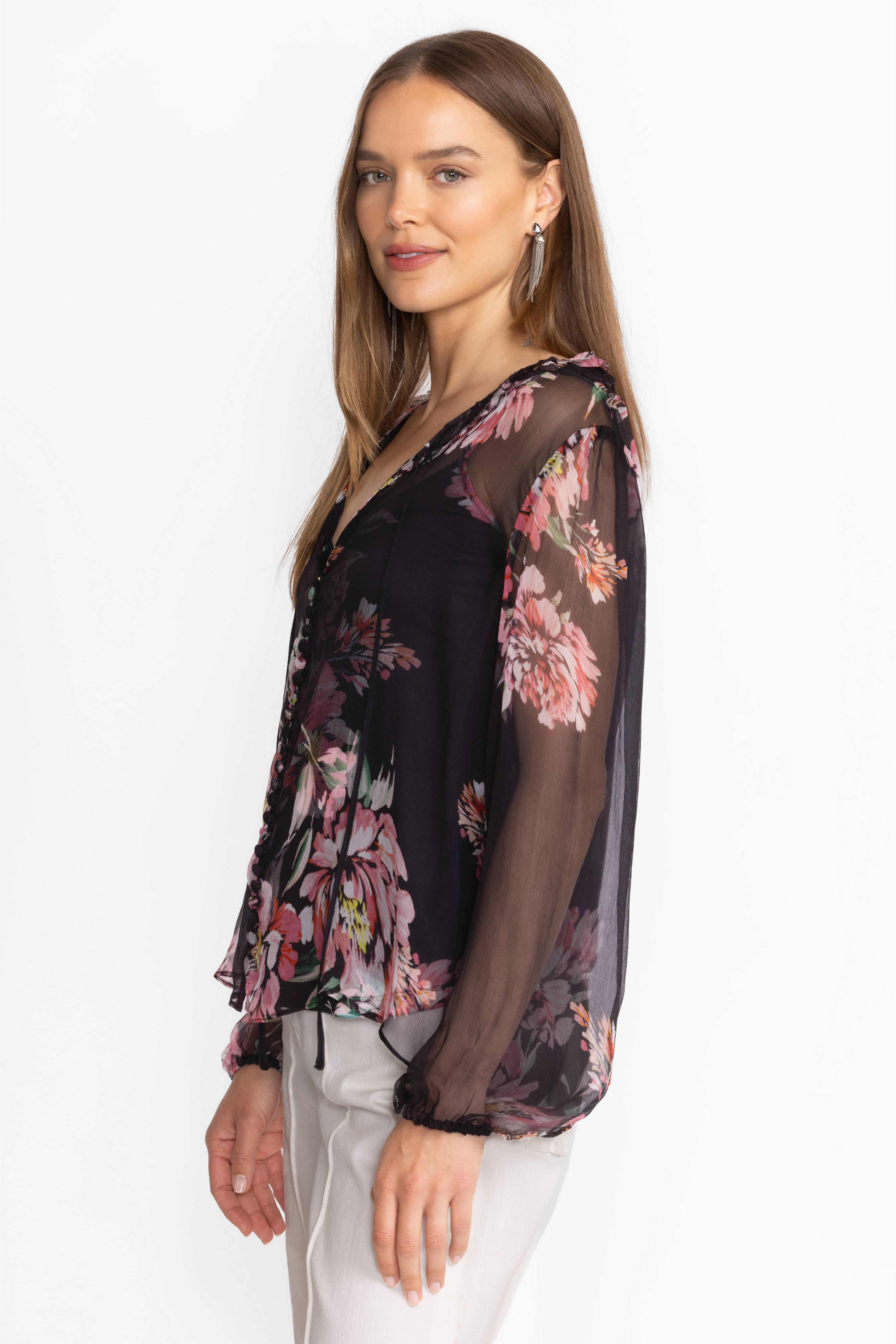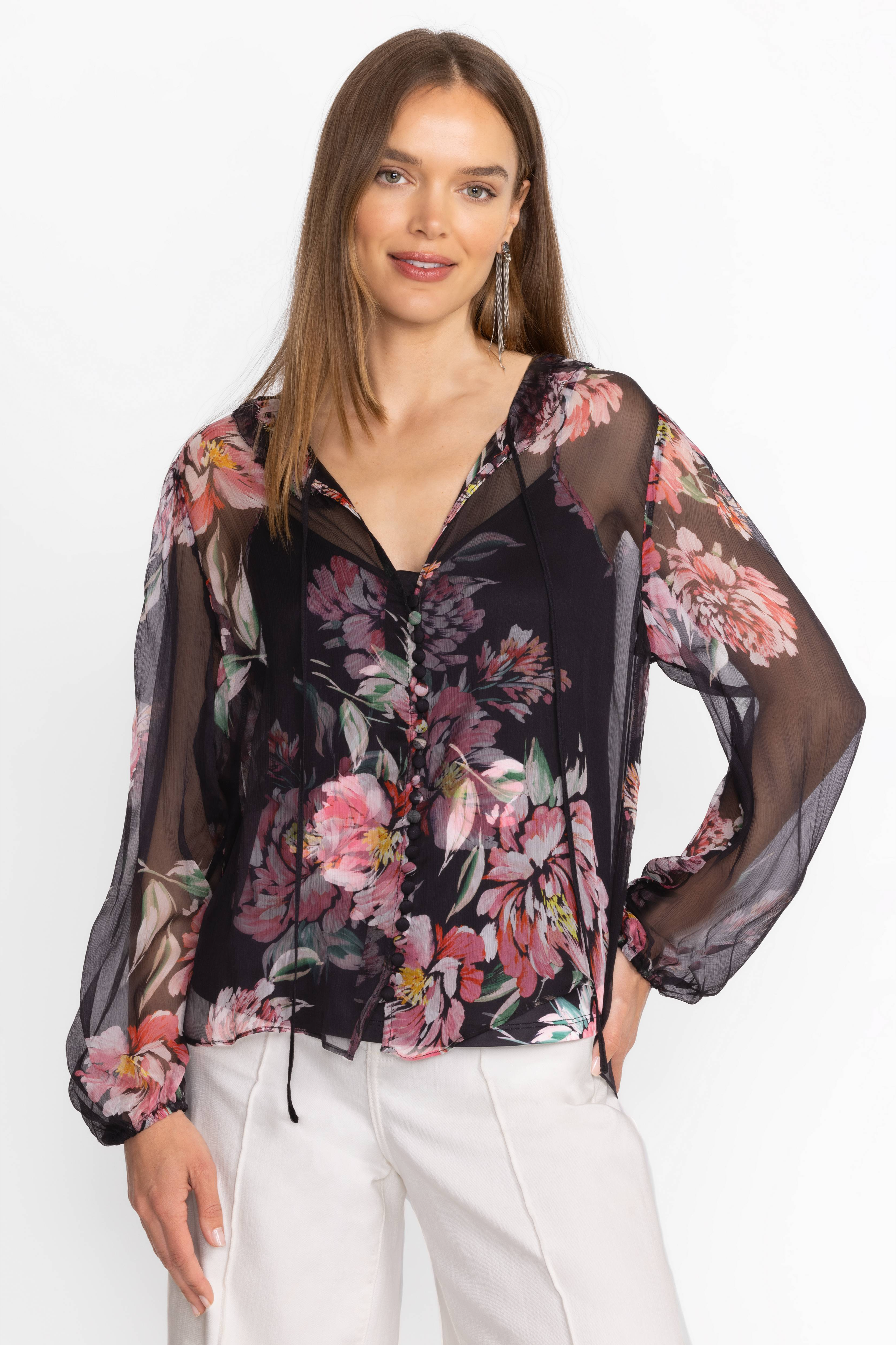 Crafted from 100% sumptuous silk, the Jaycee Peasant Blouse is adorned with delicate pink floral blooms. Featuring intricate ruffles at the neck and gathered sleeves, this slip-lined blouse is finished with fabric covered buttons and loops. Pair with a classic pencil skirt and black pumps for a polished workday ensemble