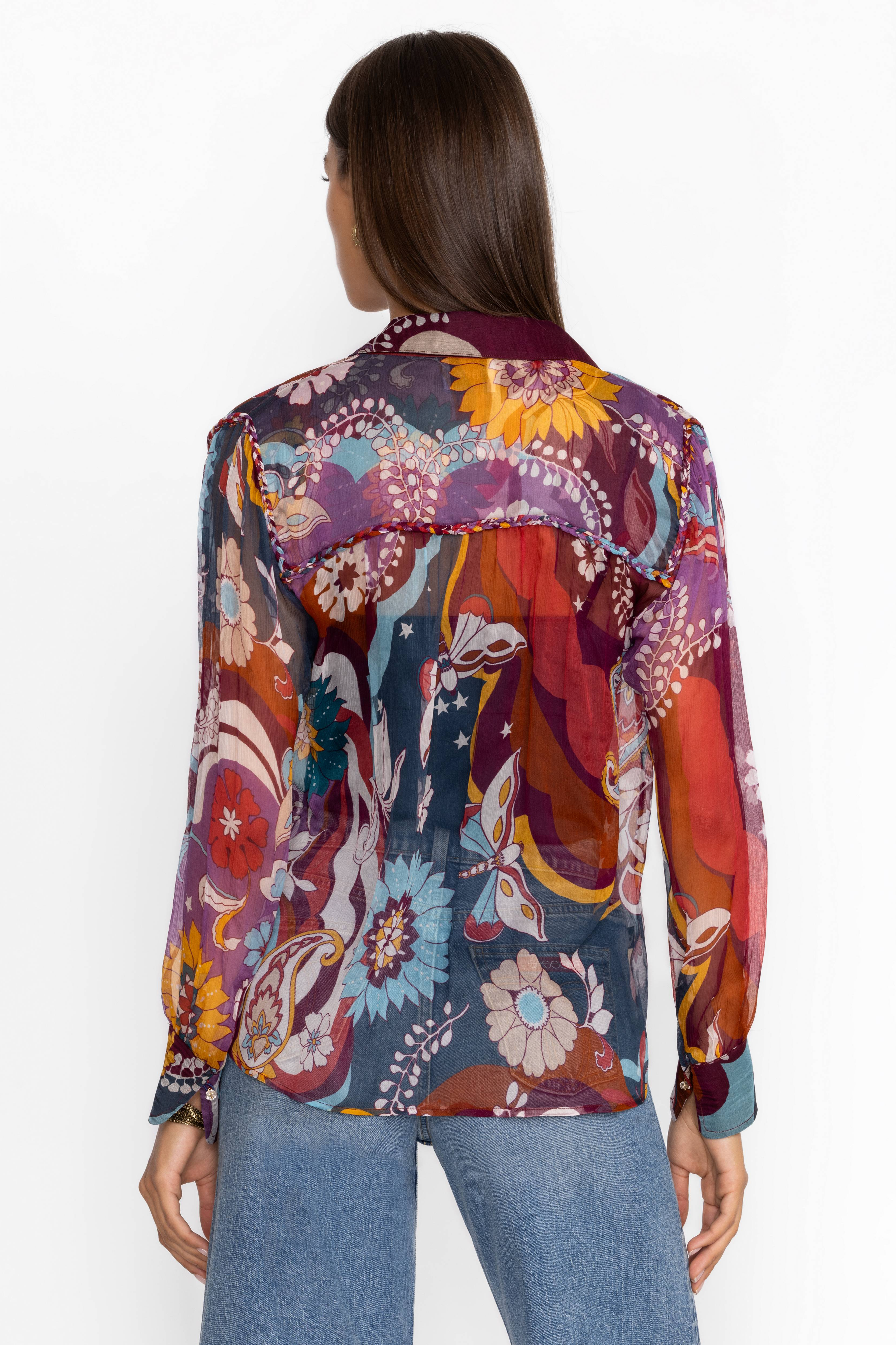 Crafted from 100% luxurious silk, the Katerina Braided Blouse by Johnny Was is adorned with a bold and colorful multi-dimensional pattern. Featuring a collared button-front and cuffs at the sleeves, this slip-lined blouse offers intricate braided detailing at the yoke for a unique look.