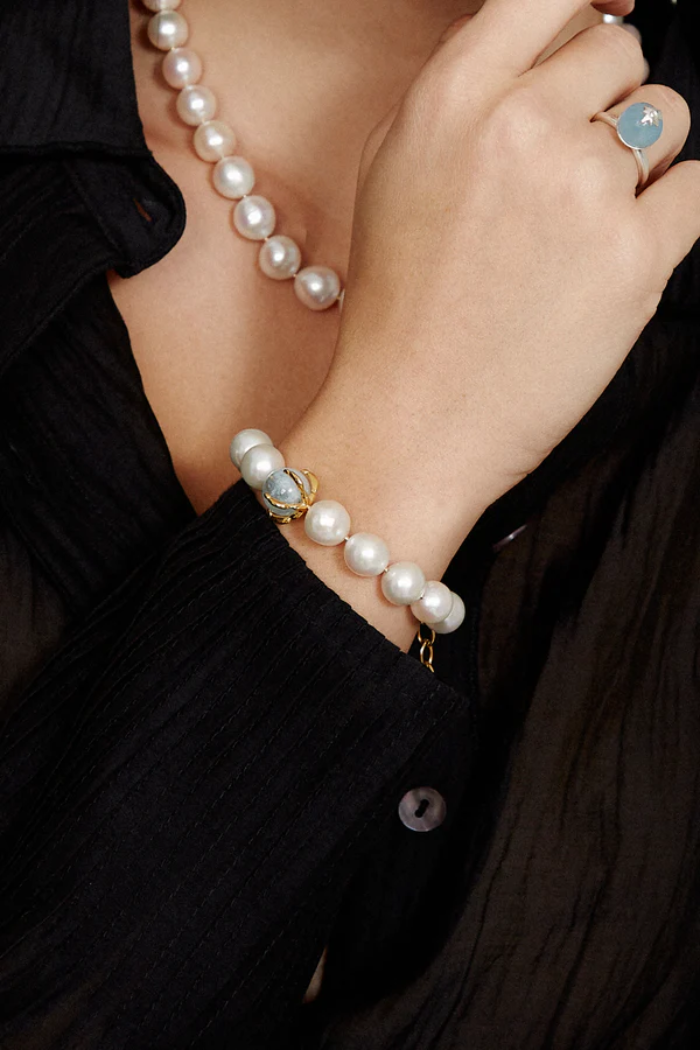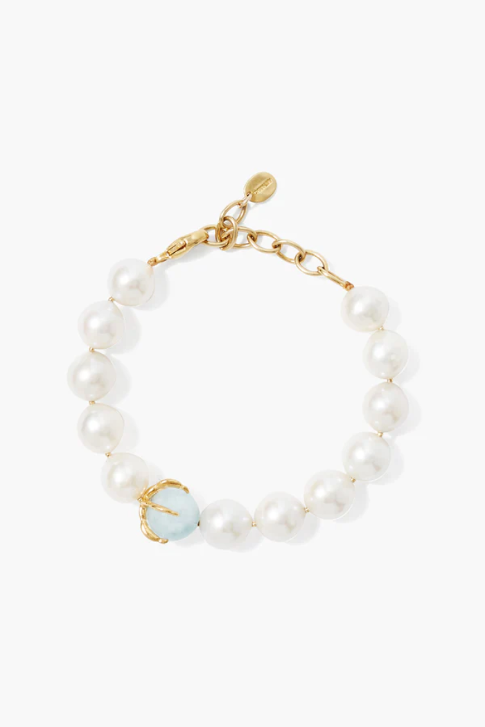 Chan Luu White pearl bracelet with a bird claw motif clutching an aquamarine bead.
