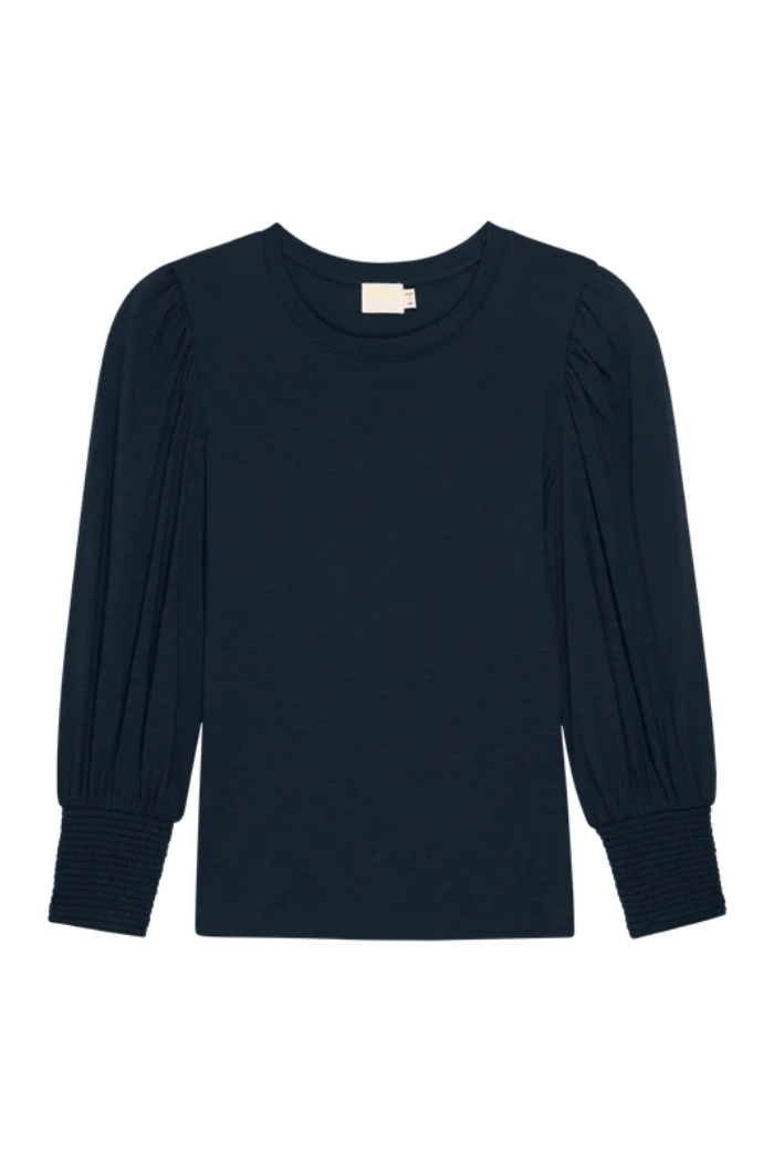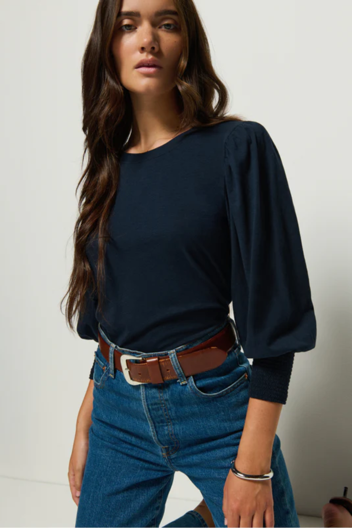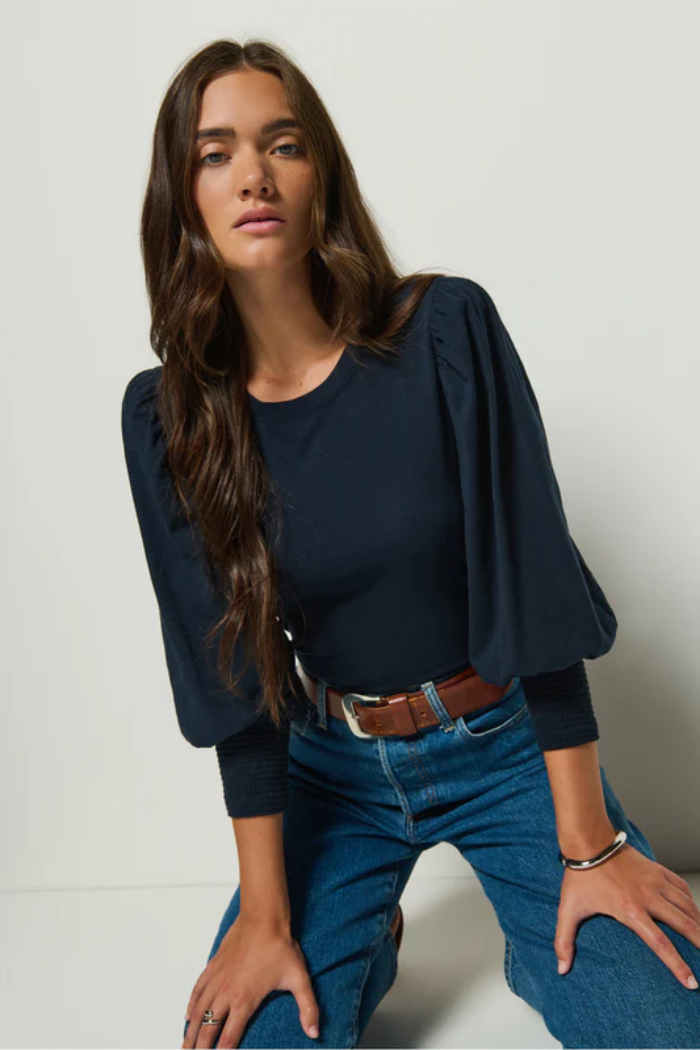 The ease of a comfortable, cotton tee meets the look of a fancy blouse. An exaggerated shoulder, volume in the 3/4 length sleeve, and smocking around the cuff create a delightfully feminine look. It's our best seller for a reason. This one comes in Night Sky.
