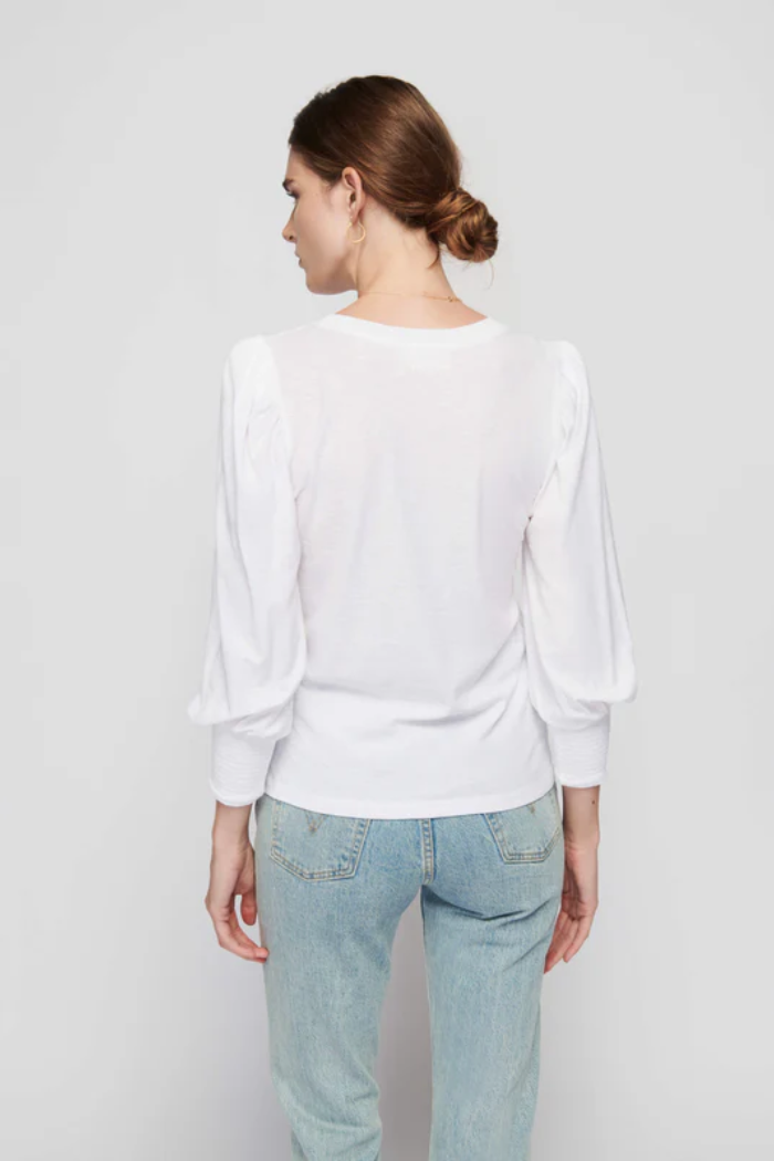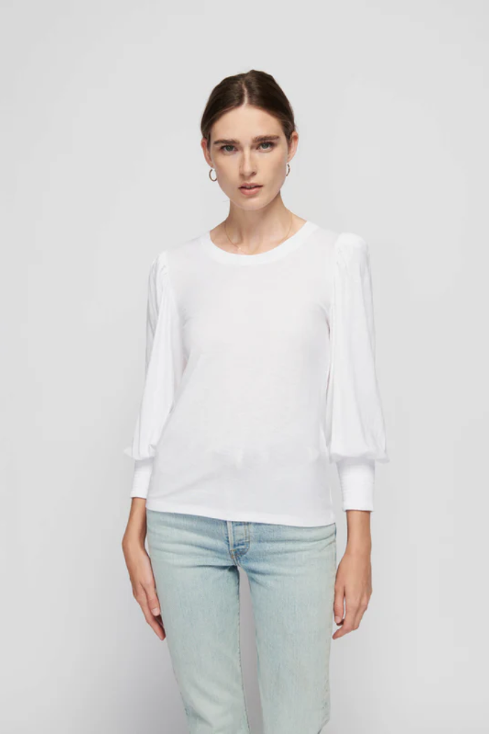The ease of a comfortable, cotton tee meets the look of a fancy blouse. An exaggerated shoulder, volume in the 3/4 length sleeve, and smocking around the cuff create a delightfully feminine look. It's our best seller for a reason. (This one comes in White.)