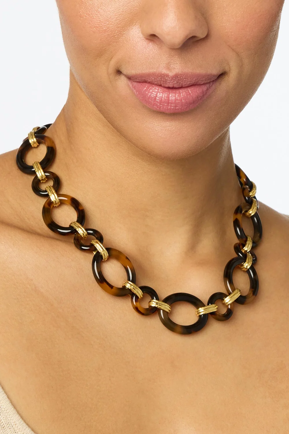 Ovals and rings made from polished translucent tortoiseshell alternate with lightly hammered golden links and close with a matching gold toggle.