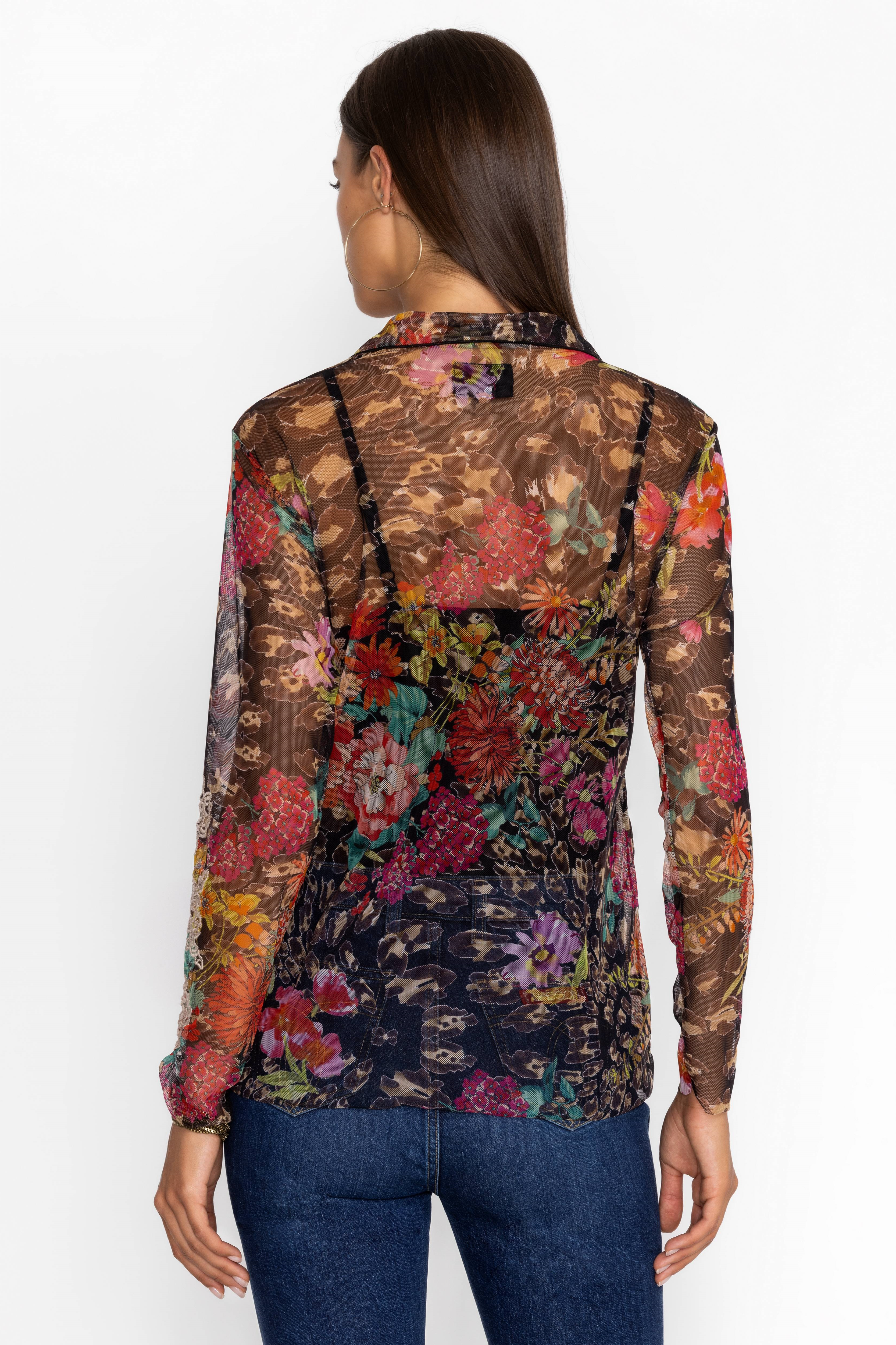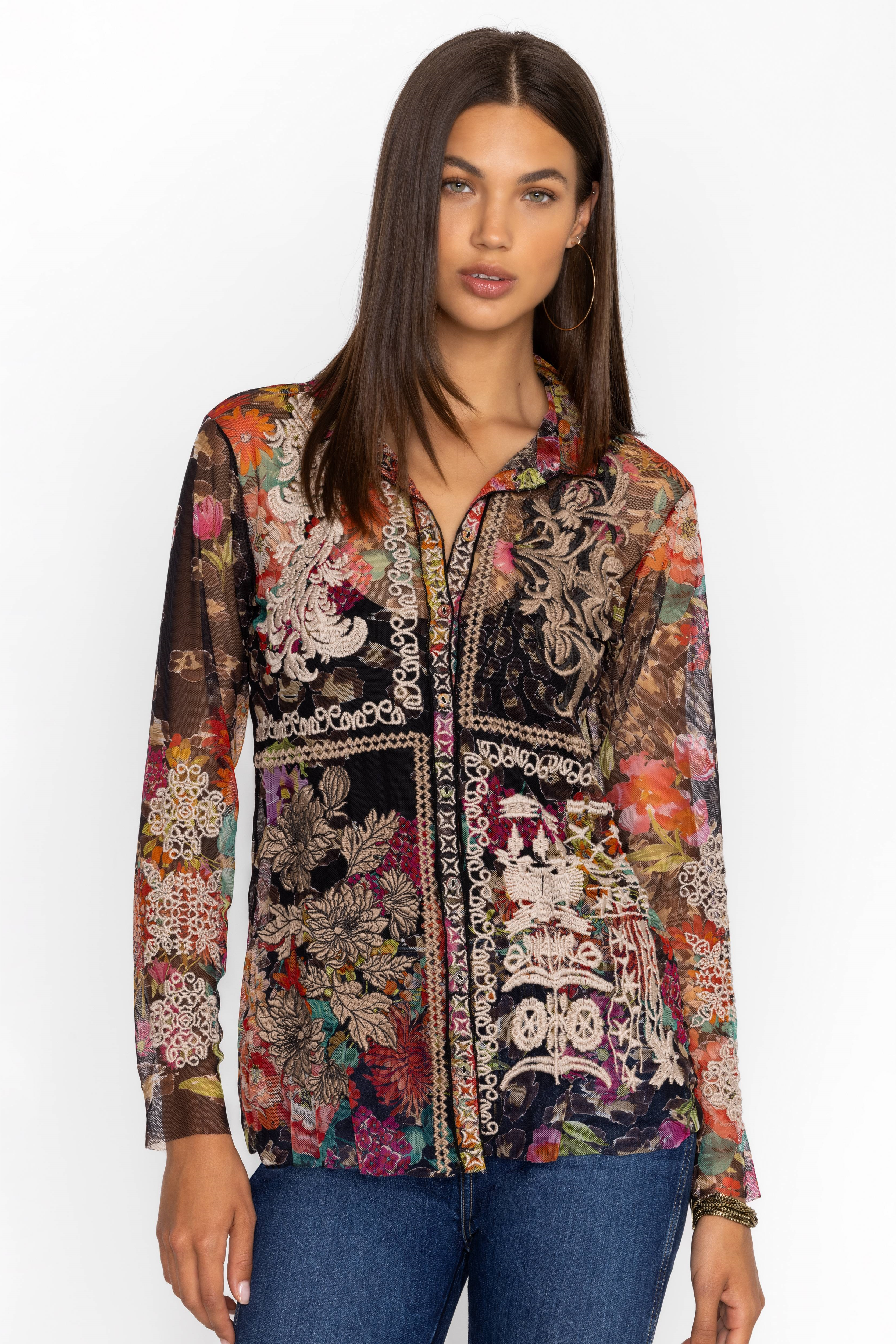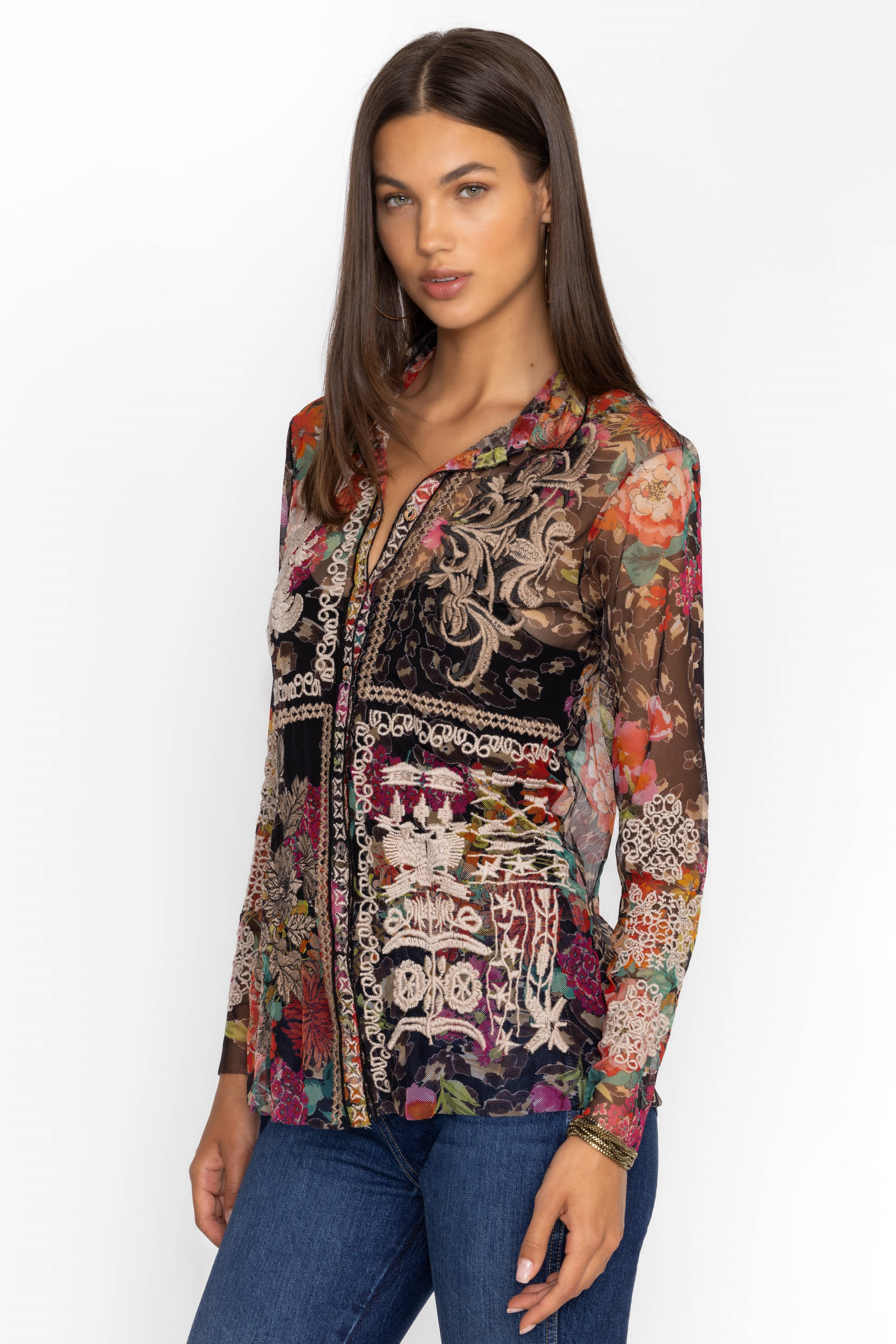 Crafted from a lightweight mesh fabric, the Mazzy Button Down Fitted Blouse by Johnny Was is adorned with a fresh, feminine floral pattern. Featuring a classic collared button-front and long sleeves, this slip-lined blouse is finished with intricately detailed placement embroidery.