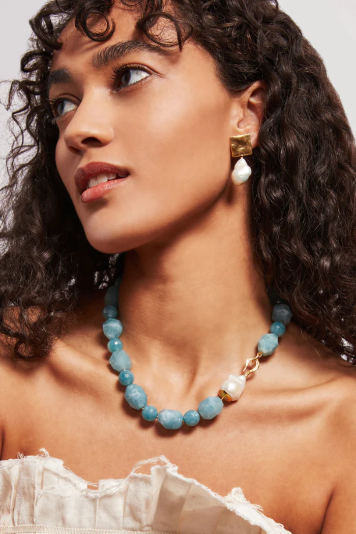 Break from tradition with these daring drop earrings featuring a luminous baroque pearl on a gold square post with hammered detail. A bold statement on its own. Baroque pearls are one of a kind so size and shape may vary.