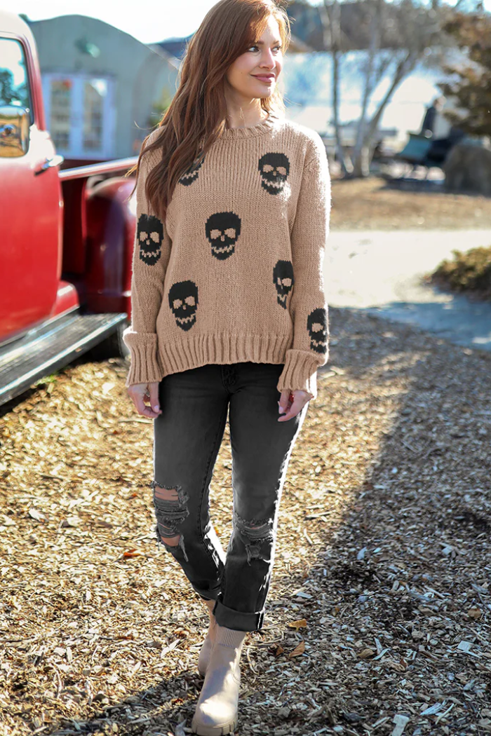 Buttery soft and incredibly cozy, this comfy top by Wooden Ships features skull graphics knit directly into the sweater throughout the body and sleeves. The fit is relaxed and flattering, with mini side slits. Cozy details include ribbing on the neckline, hem, and cuffs.