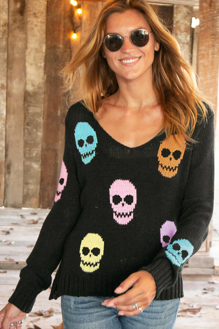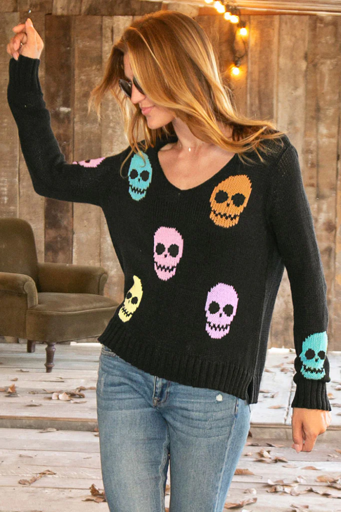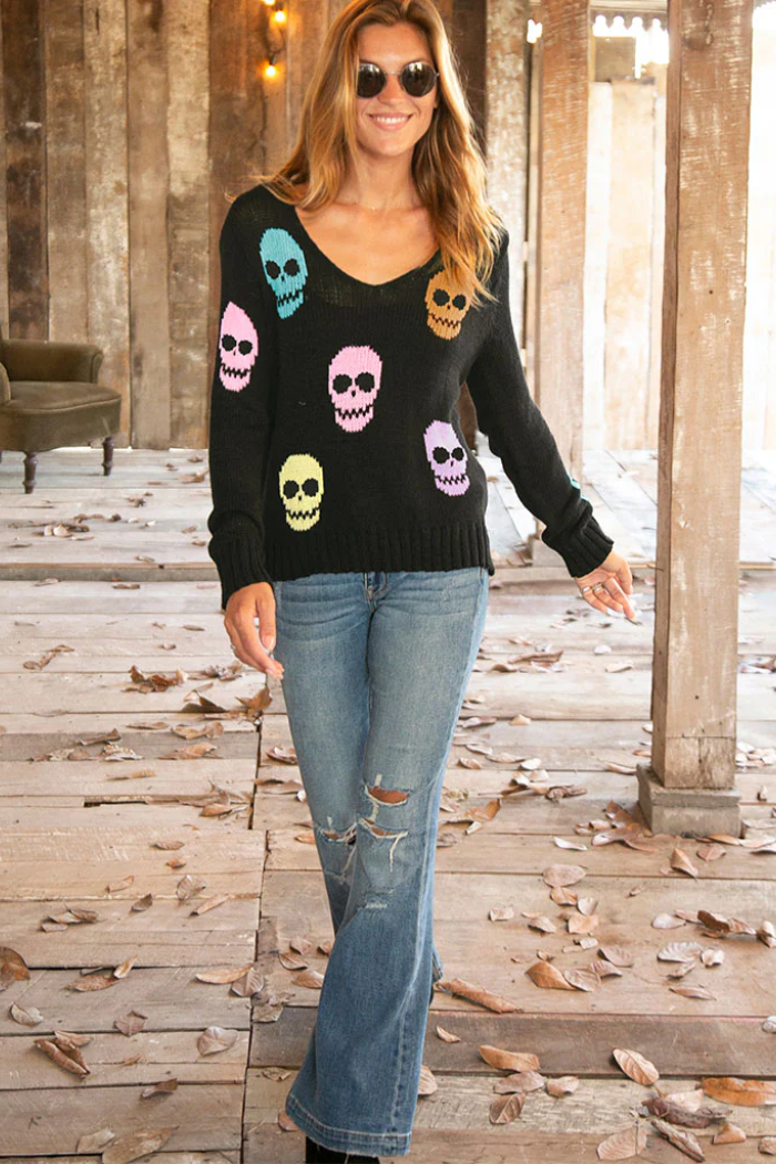 This soft, lightweight, and breathable top is knit with an open construction for an airy feel and features skull graphics knit directly into the sweater throughout the body and sleeves in multiple colors. The fit is relaxed and flattering, with mini side slits. Cozy details include ribbing on the hem and cuffs.