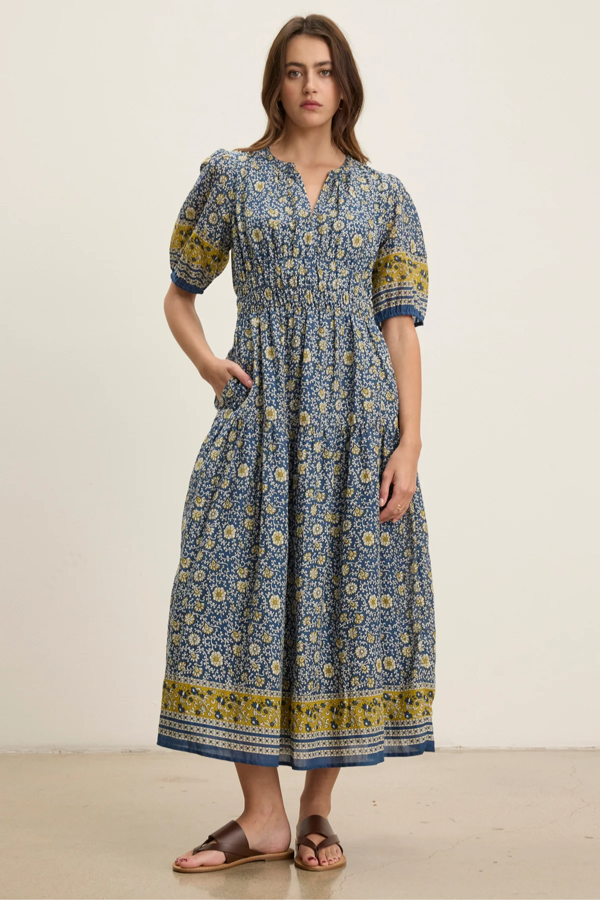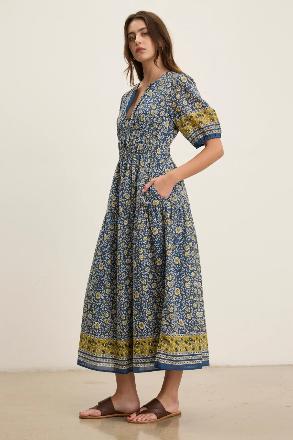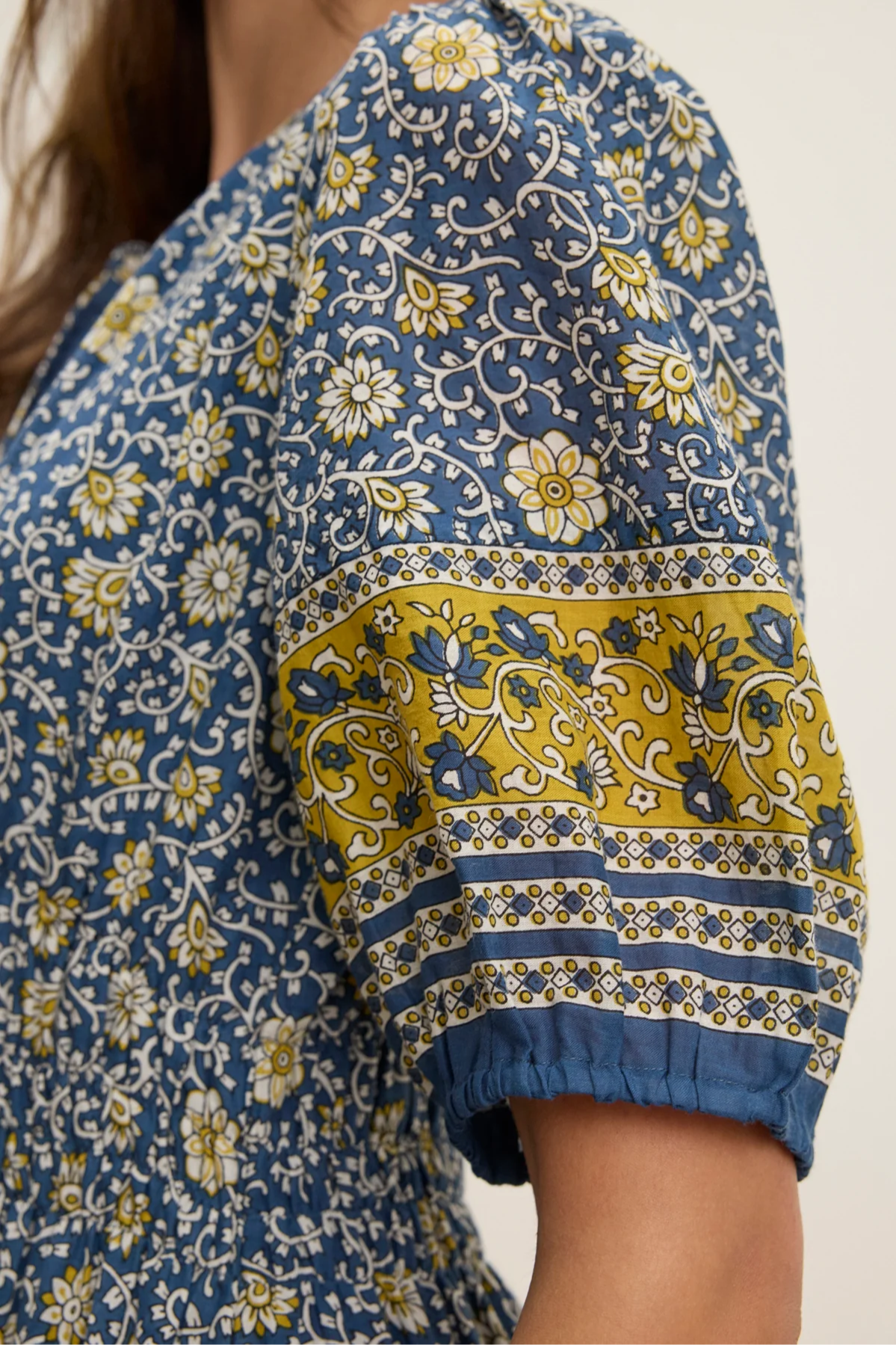 A flattering V-neck and puff sleeves with elastic cuffs create a feminine silhouette in this light, printed cotton dress. The elastic smocked waist and side seam pockets offer both comfort and style, while the A-line shape flows elegantly. Featuring a branded collar and a unique block print, this dress combines modern design with effortless chic.
