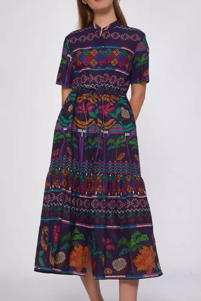 Long tropical print dress with blue background. Flowy, round neckline and short sleeves. Exclusive Vilagallo fabric made in Spain. The model is 1.76 cm tall and is wearing a size 38.