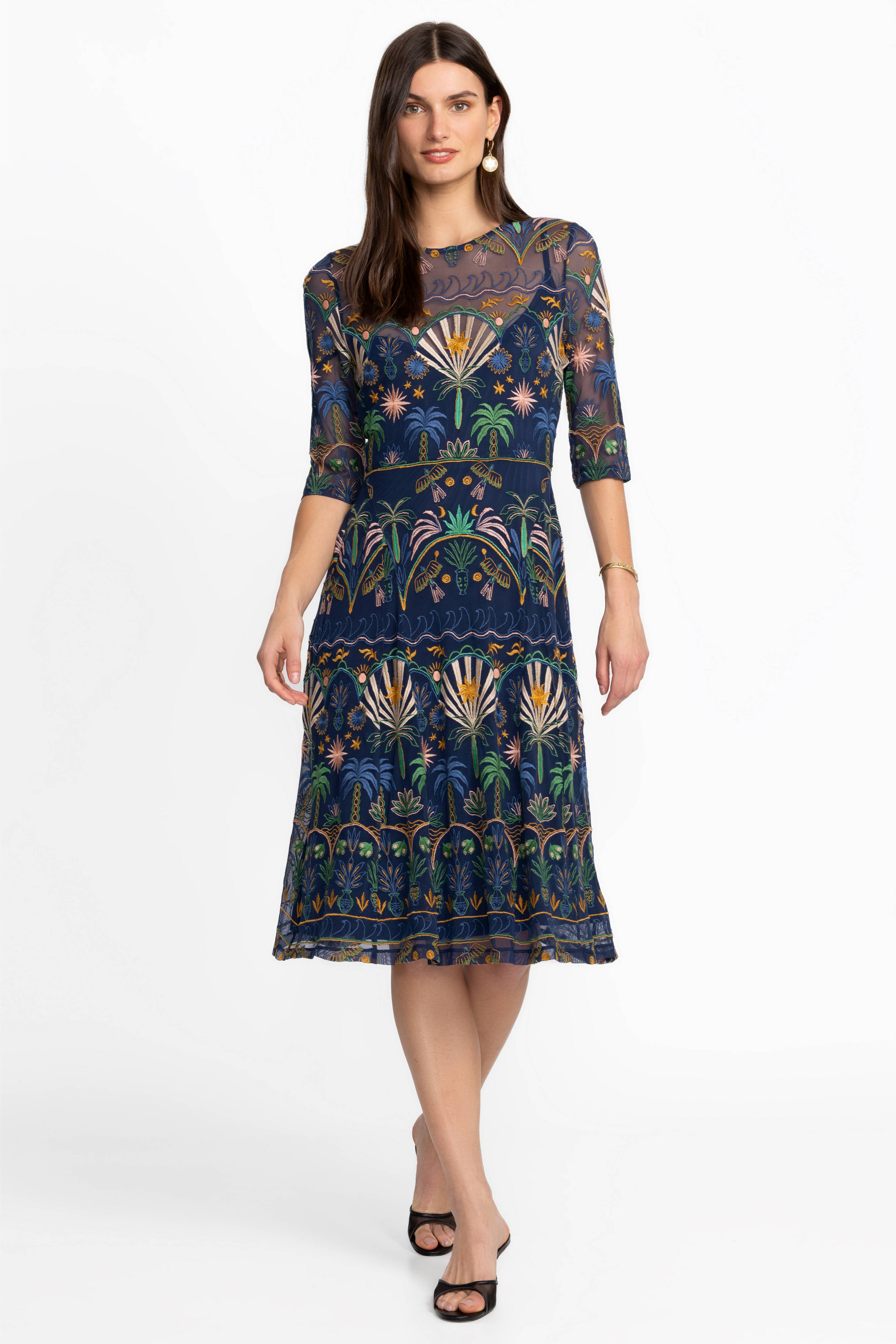 Crafted from a lightweight fabric with a hint of stretch, the Nova Paneled Midi Dress is embellished with brilliant color and intricate designs. Featuring a crew neckline and keyhole back, this fit-and-flare dress is finished with 3/4 sleeves for a retro-inspired finished look. Pair with kitten heels and delicate gold jewelry for a polished evening look.