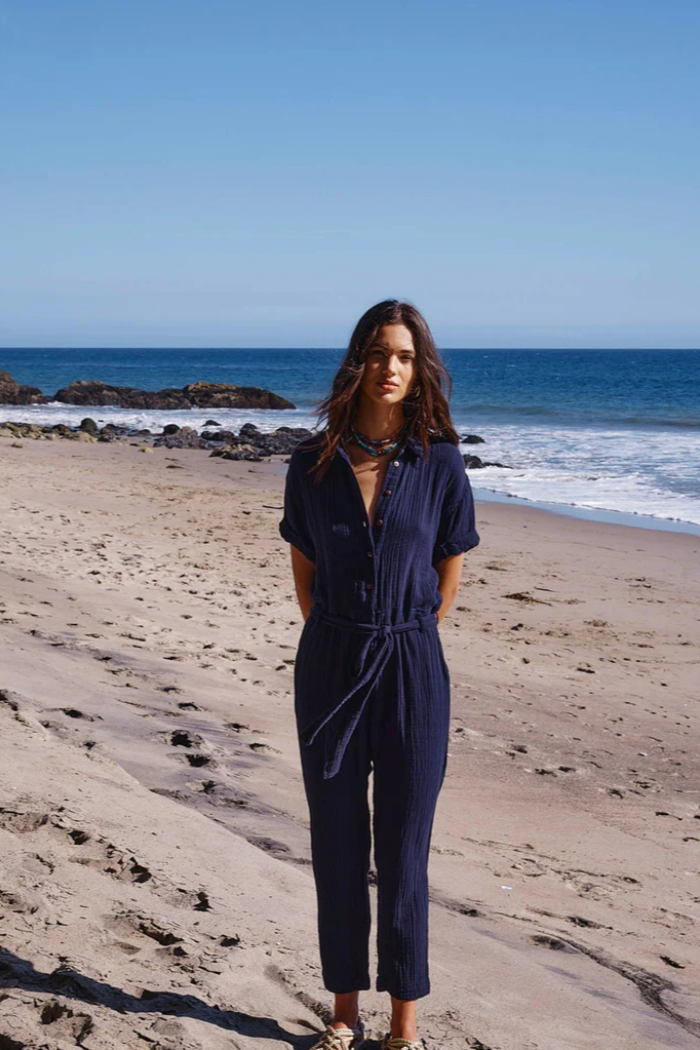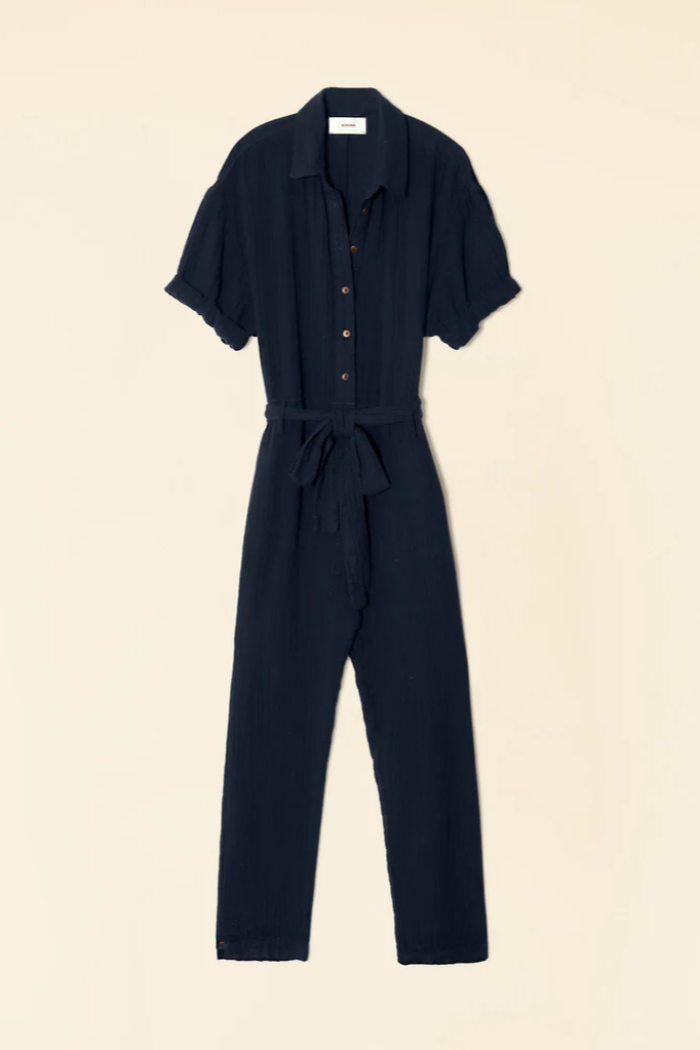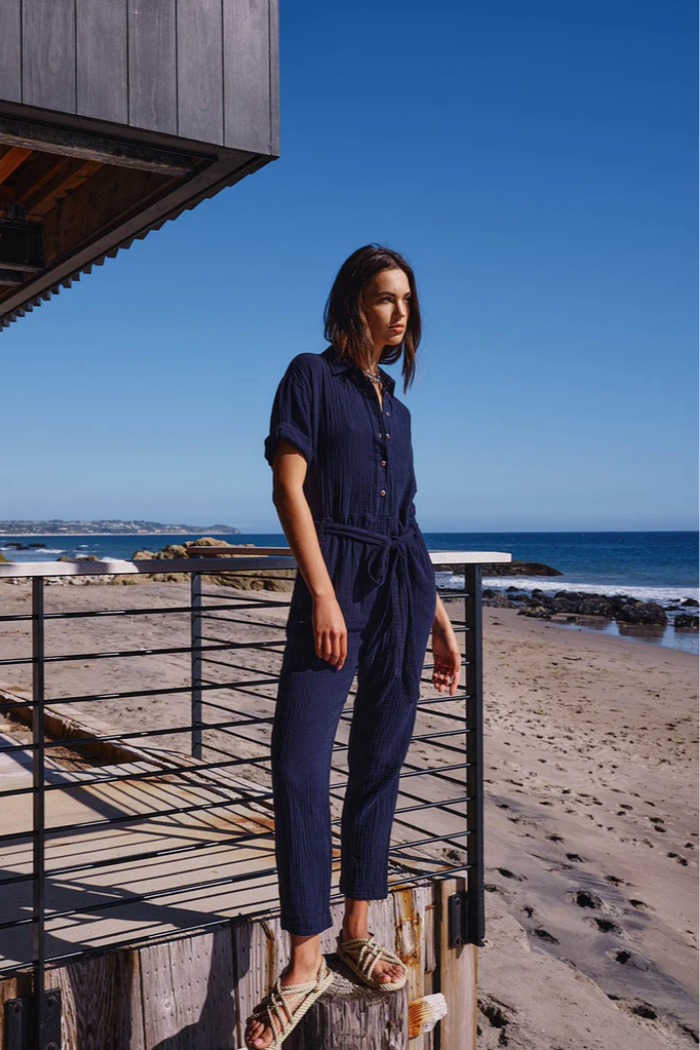 Vacation Mode. Oakes is new this season in Xirena's washed double faced cotton gauze for a soft, gently crinkled feel. This straight-leg jumpsuit features a button-front with bamboo buttons, rolled sleeves, hidden fly, self-belt with belt loops, and on-seam pockets.