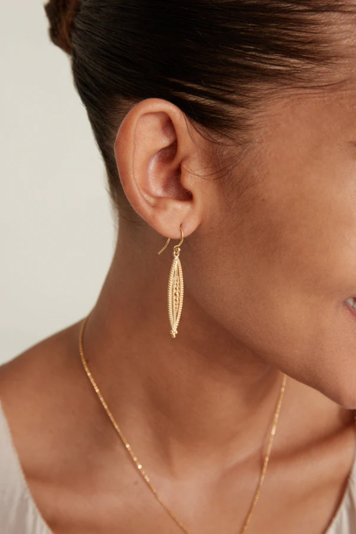 Gold marquise pendants with dotted embellishments are the focal point of these sleek earrings finished on French hooks.