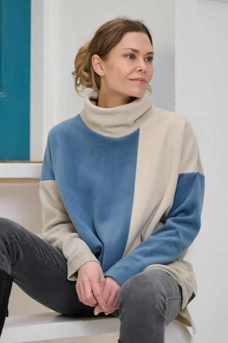 Multicolored box-shaped sweater fleece with high neck. The sweater is longer in the back and has slits up the sides.