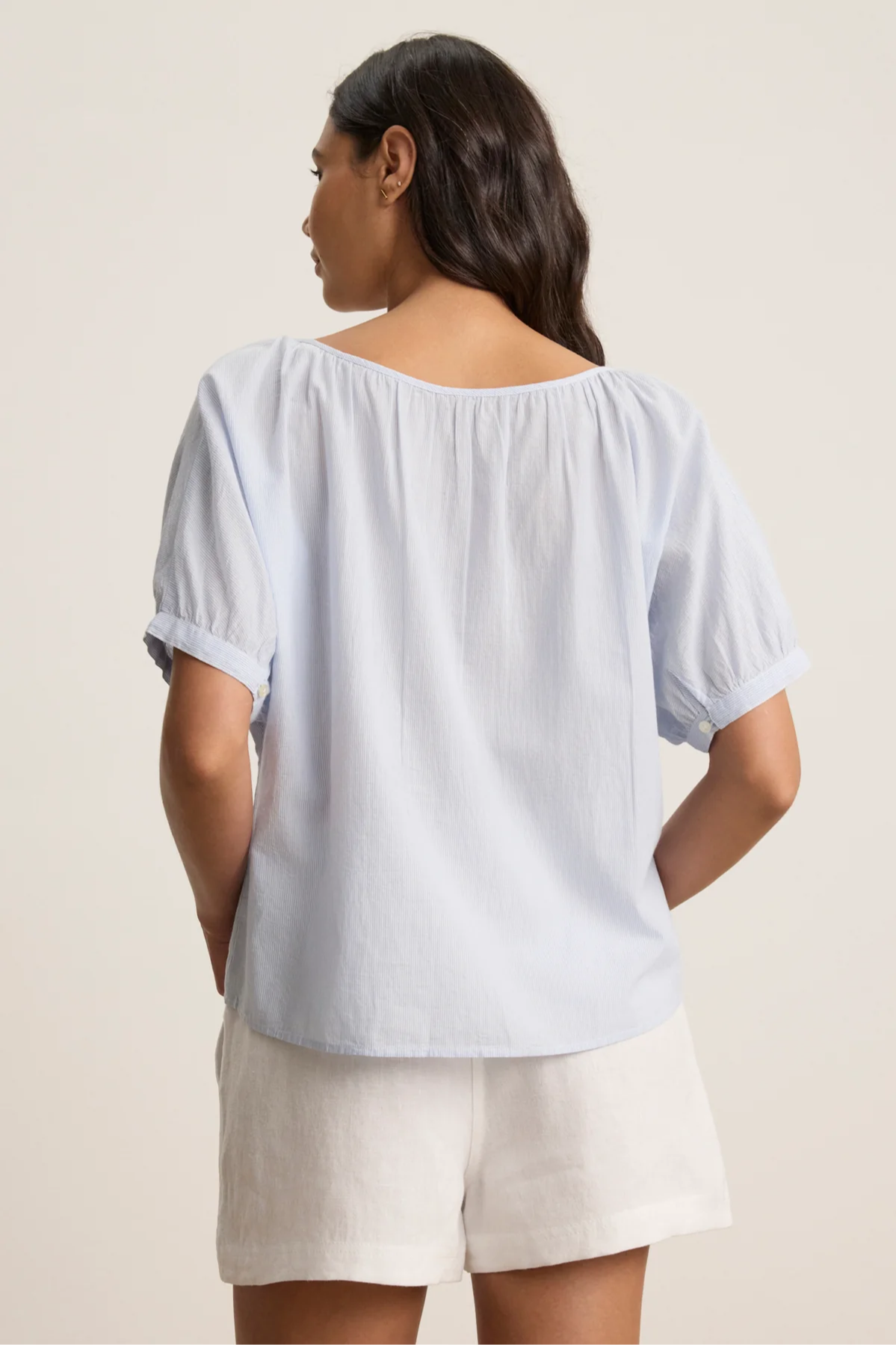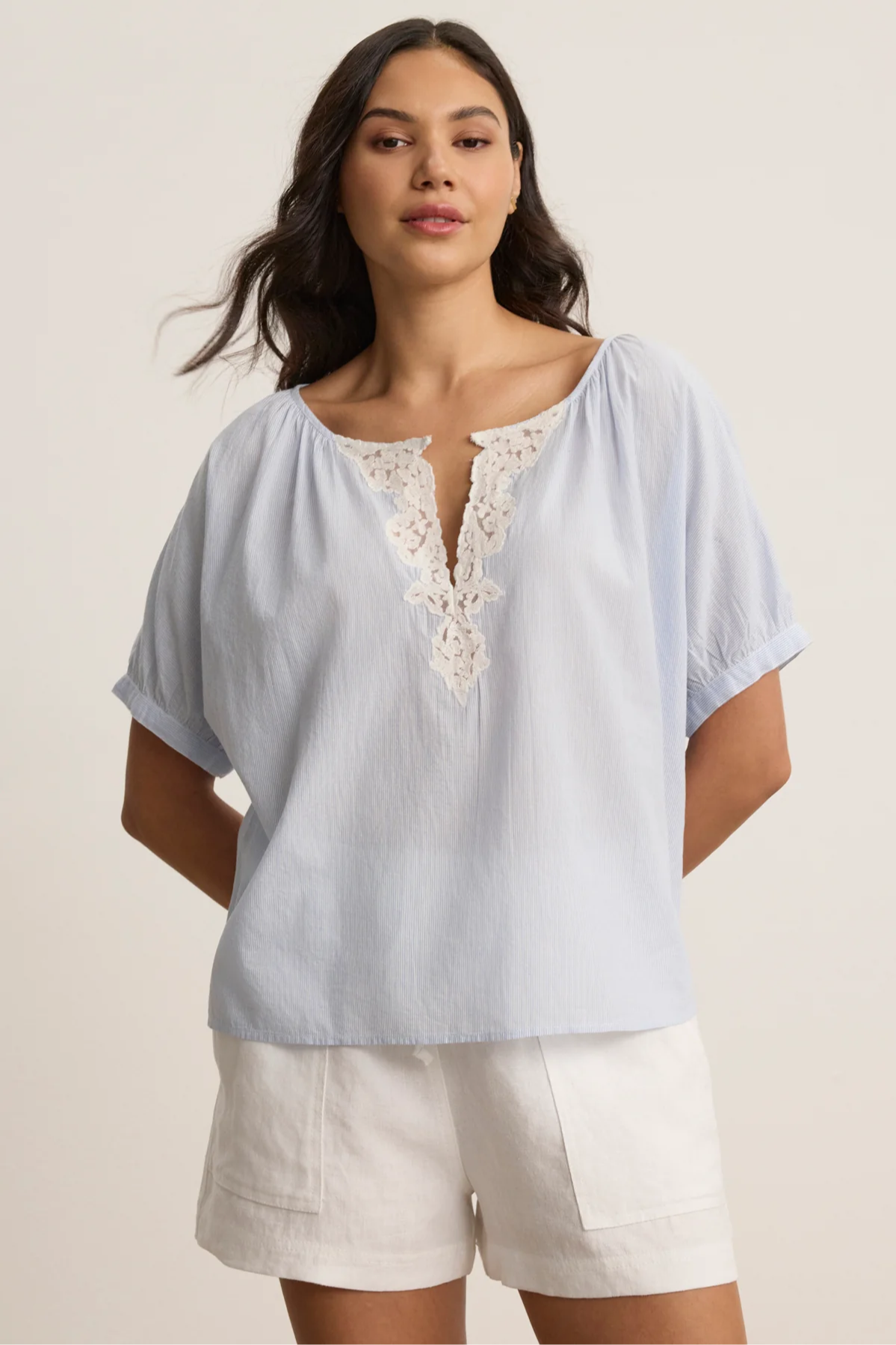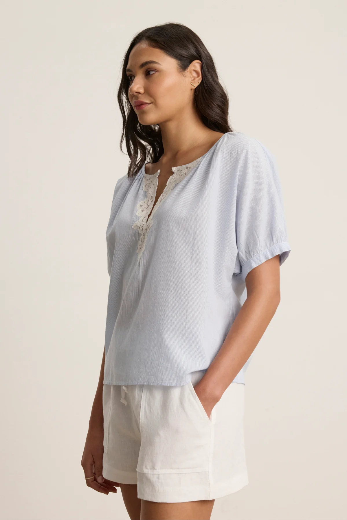 A versatile boatneck design with a front keyhole closure allows this yarn-dyed blouse to be worn as a V-neck for added styling options. Dolman sleeves, delicate lace detailing, and banded cuffs with a single button closure enhance its relaxed, boxy fit.