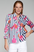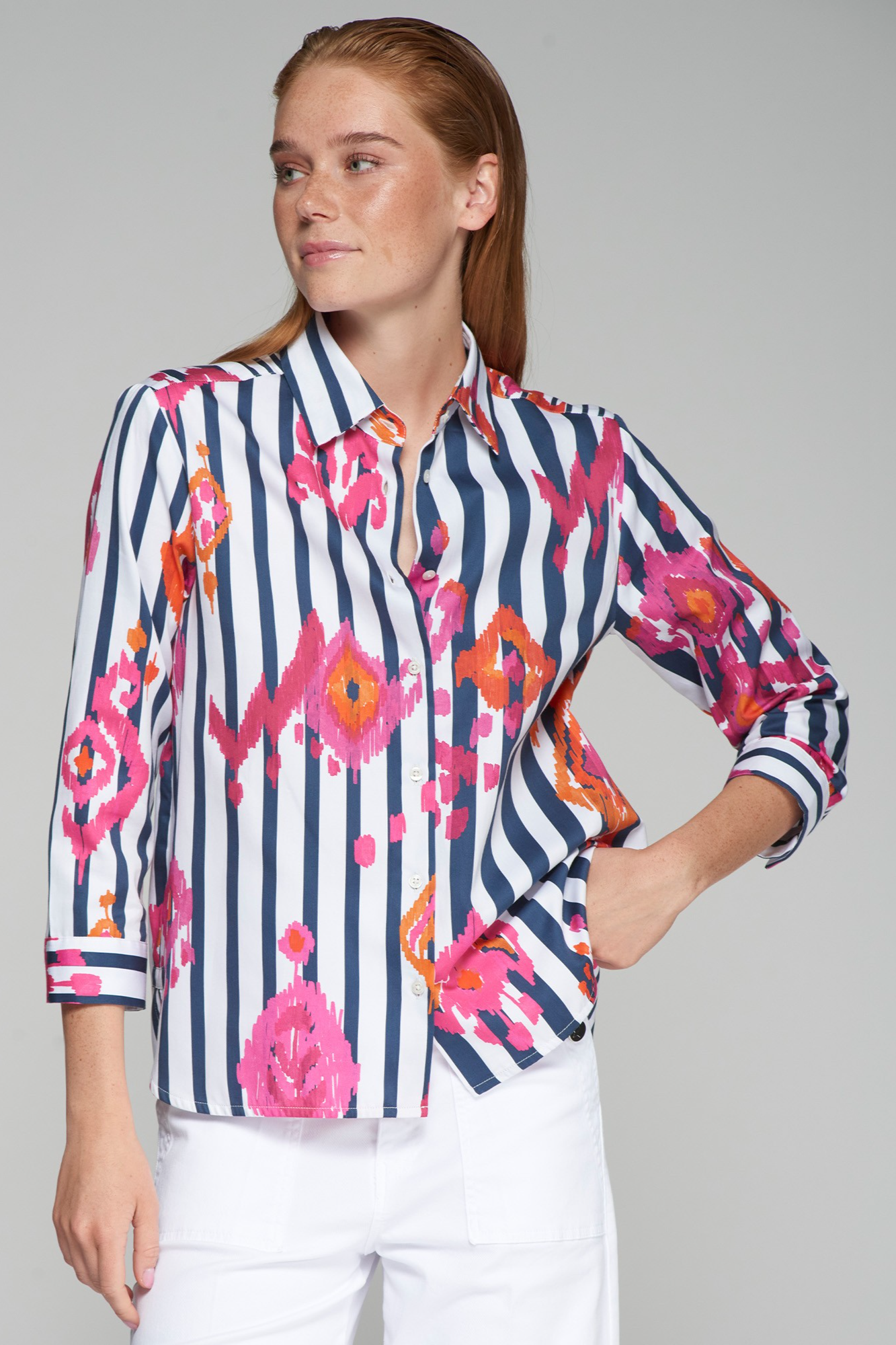 Navy blue and white striped shirt with ikat print in pink and orange. Front button fastening. Three-quarter sleeves with cuffs. 100% cotton. Matching skirt available. Model is 1.74 and wears size 38.