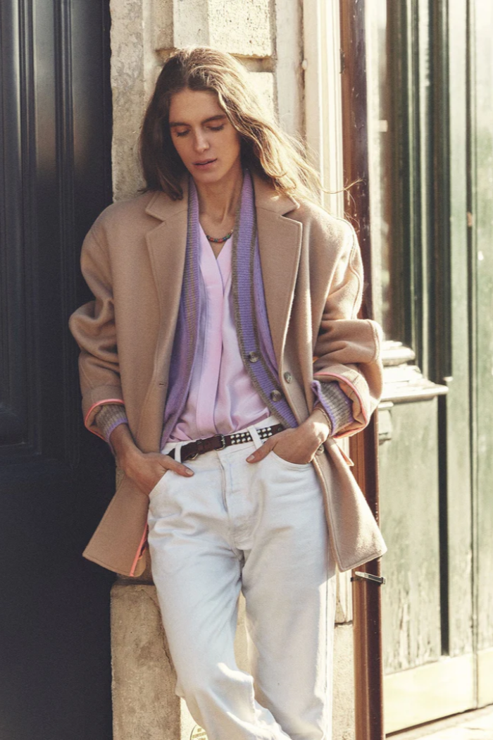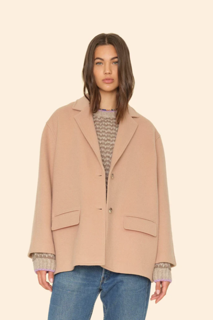 Cover Story. Rowan is XIrena's new wool blend oversized blazer lined with a matte satin finish and contrast color piping. This blazer features a notch collar, horn buttons, front flap welt pockets, seam details throughout, and a back hem center slit.