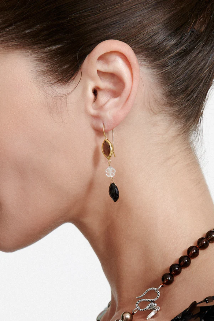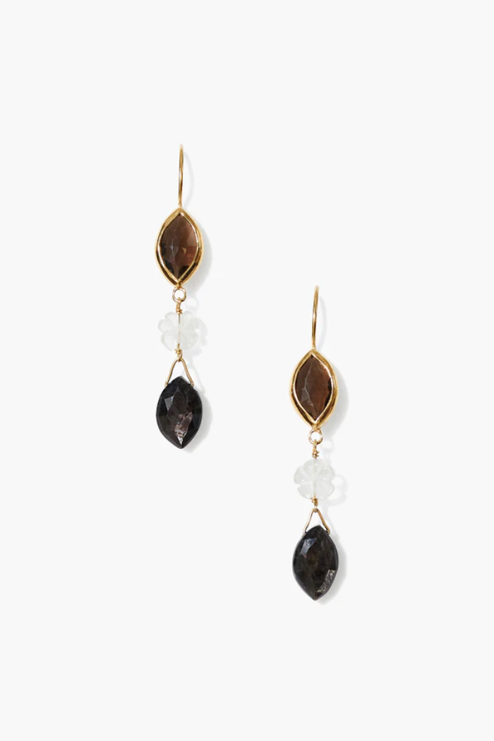Chan Luu Tiered earring with marquise-cut smoky quartz, hypersthene, and a clear quartz flower.