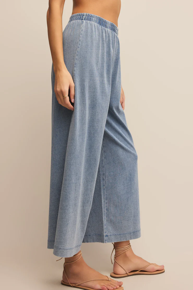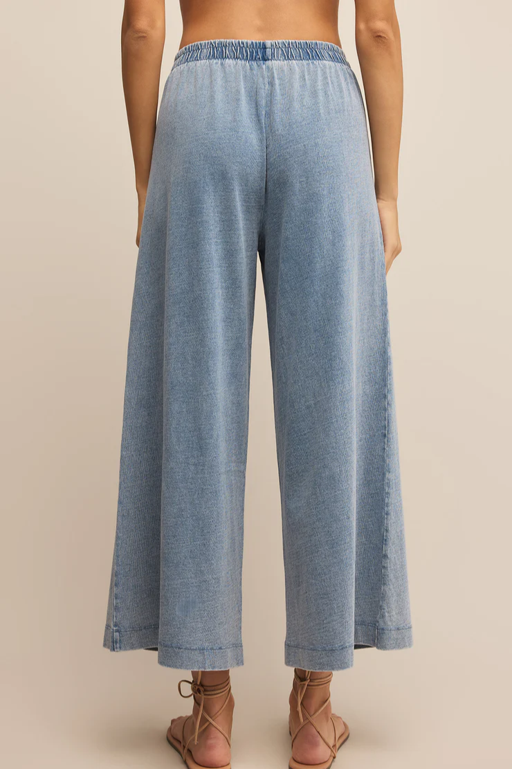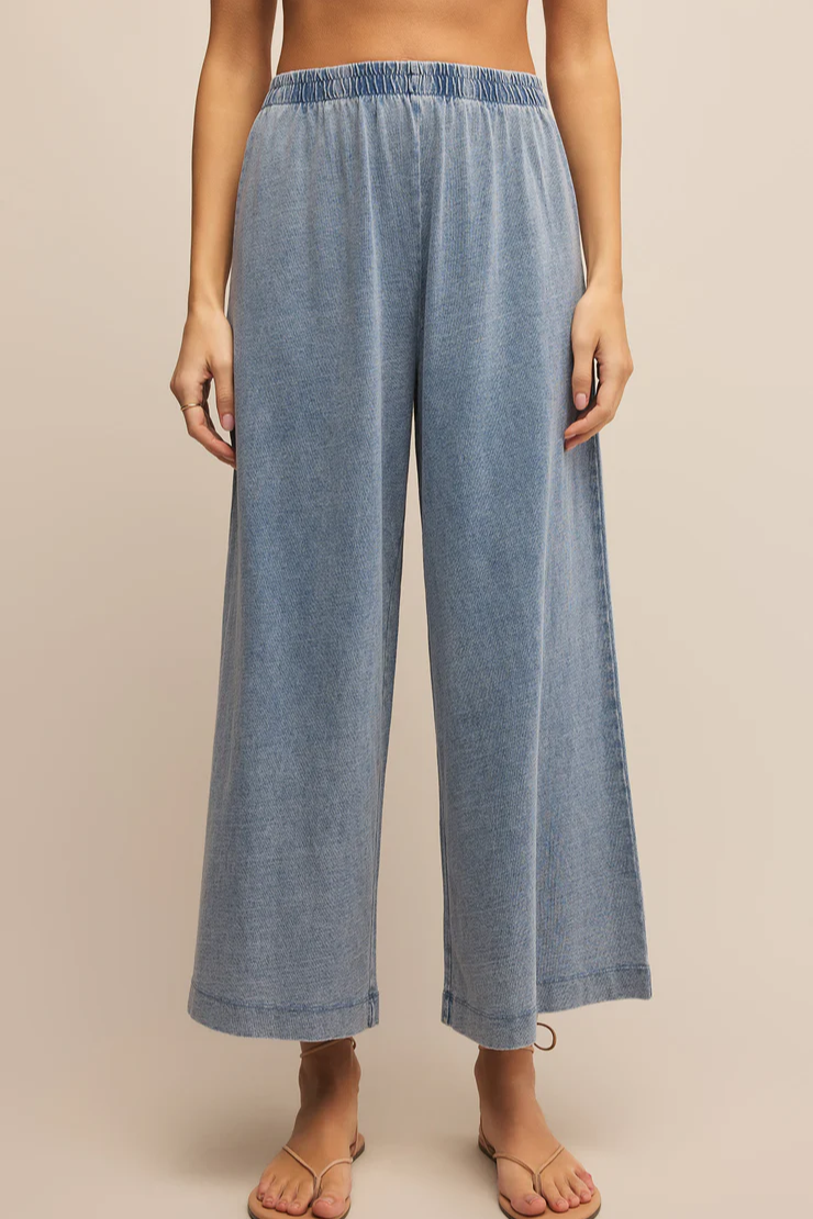 With its vintage look and soft mineral wash, this jersey denim pant is a relaxed denim dream. The elastic waistband and smooth silhouette makes an easy-to-wear style that matches with our Sloane Jersey Denim Muscle Tank.