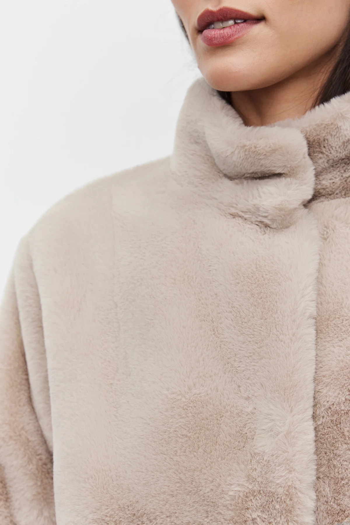 This jacket combines the luxury of soft faux fur with practical design elements, including a jumbo snap button front, mock neck collar, and slash pockets. The slightly cropped, lined construction ensures both warmth and a chic, cozy fit.