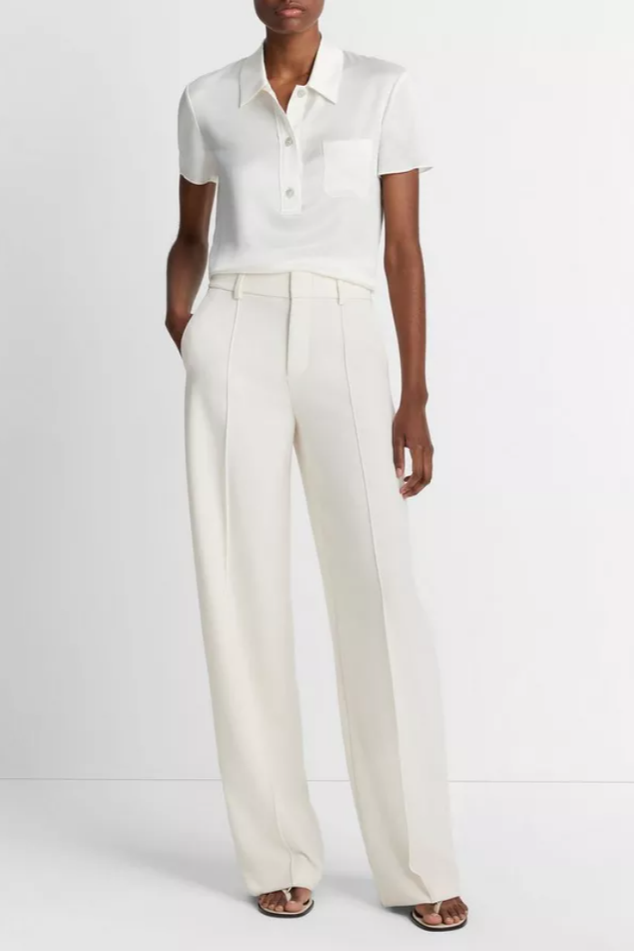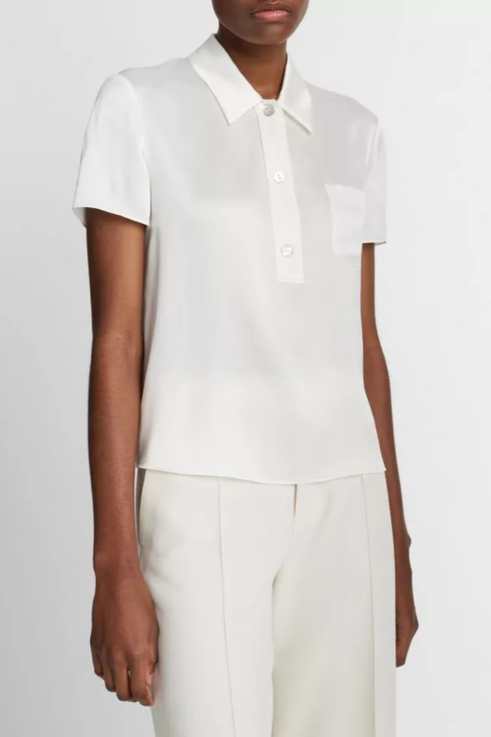 This timeless top beautifully balances the sportiness of the classic polo shirt with the softness of lustrous silk satin. To finish: our signature iridescent agoya shell buttons.