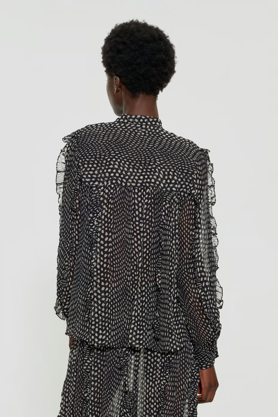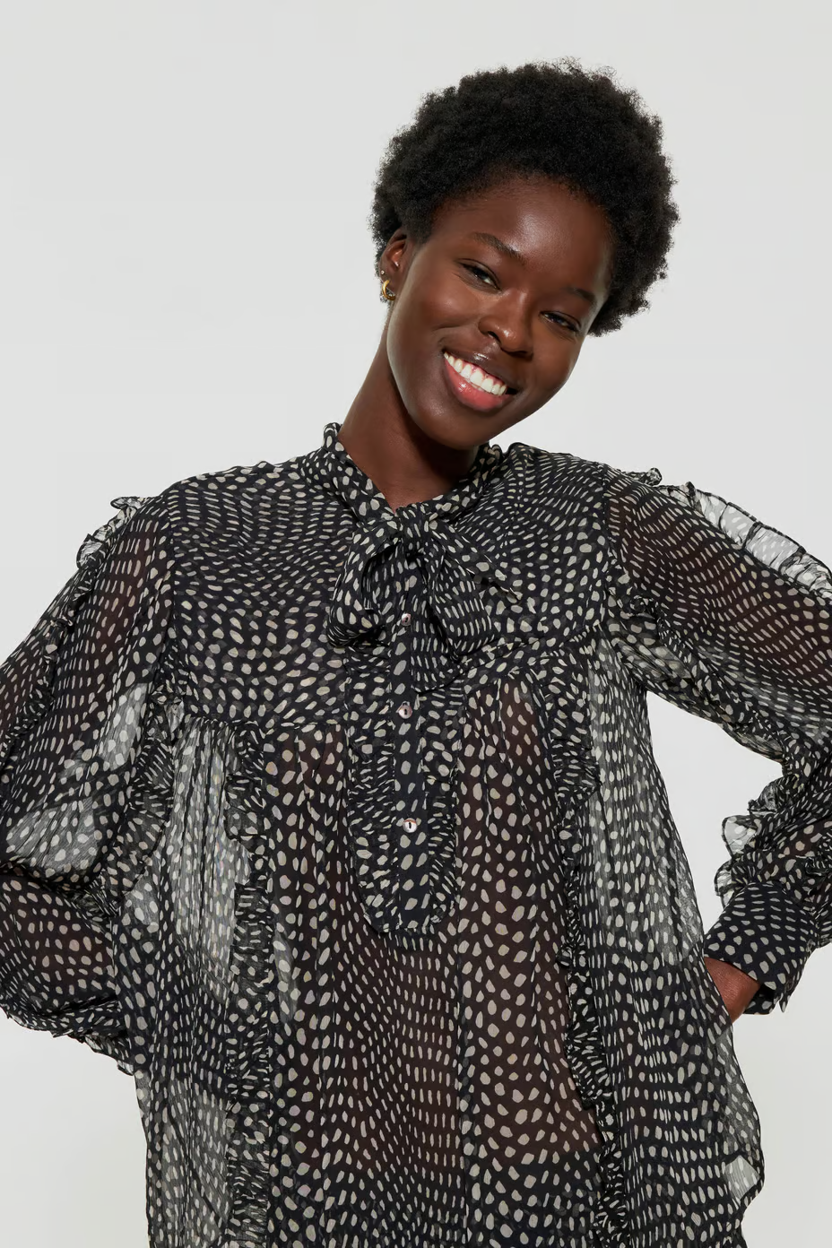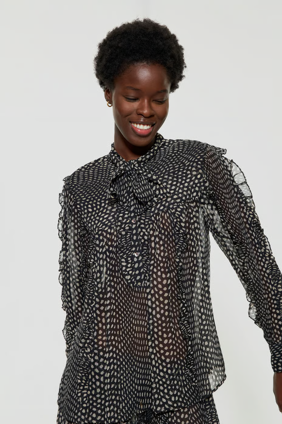 Viscose chiffon print blouse. Print designed in Antik Batik's Parisian studio. Round collar with ties. Button tab. Long sleeves. Sleeve cuff with button fastening. Ruffled ribbons on the sleeves and front. Natural mother of pearl buttons.