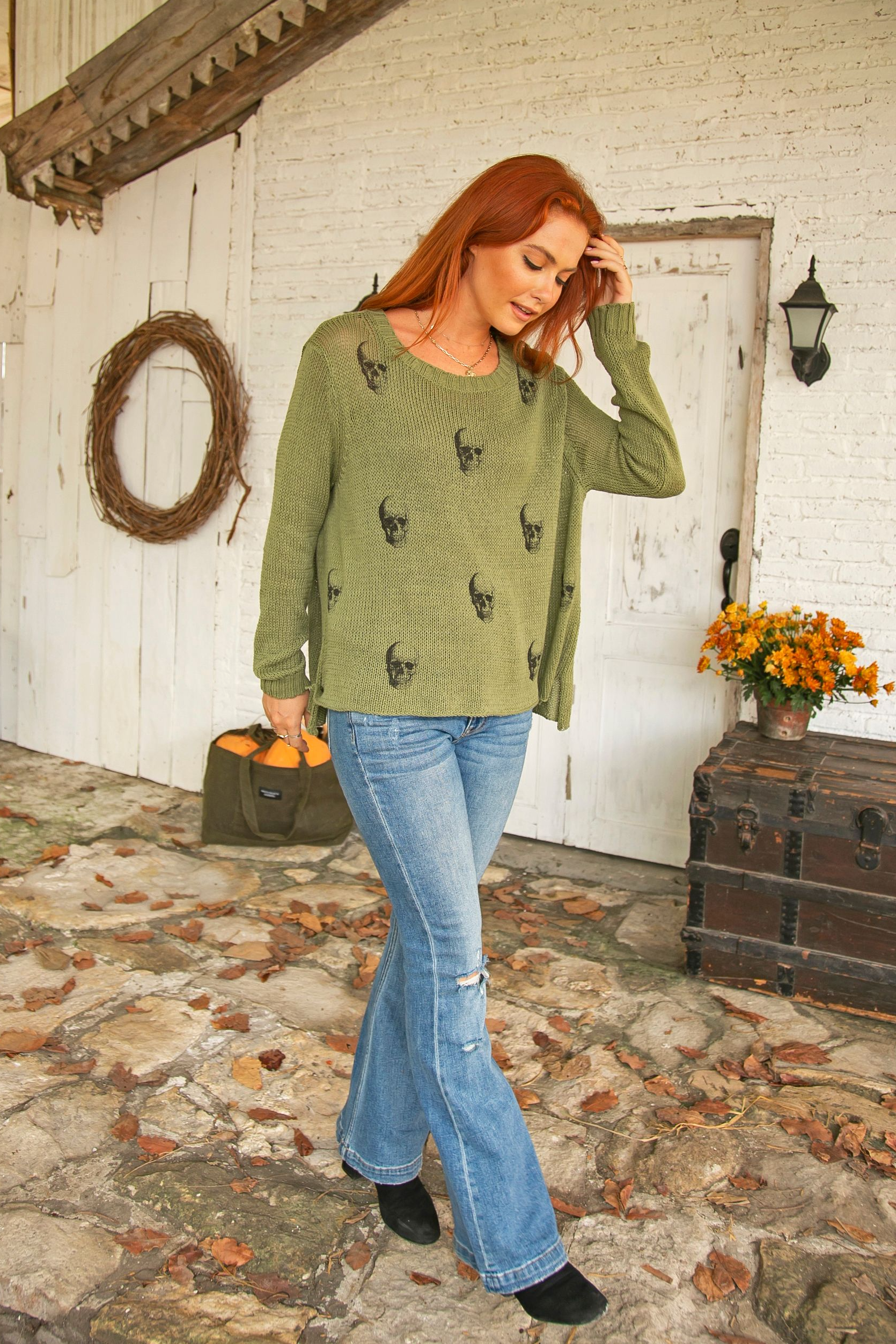 Oh-so-soft and lightweight cotton sweater by Wooden Ships. Hand printed skulls give this sweater the special variations from piece to piece that enhance the appeal. No two are exactly the same. Because we print on the outside of the knit, the inside of the garment remains soft against the skin. Production on these unique items is limited.