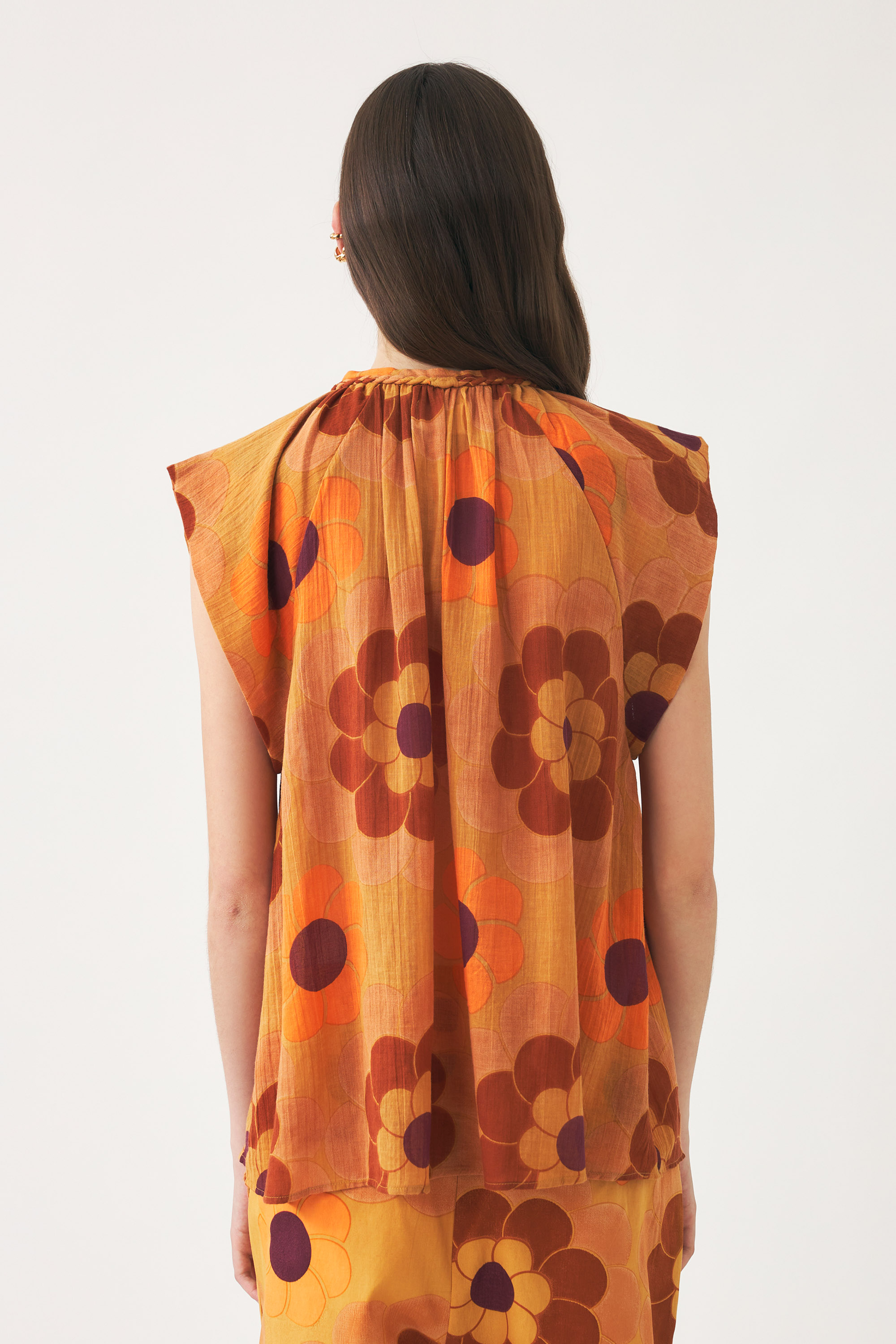 Antik Batik Cotton gauze print top. Round collar. The collar can be fastened by hand-braided ties. Short sleeves. Sixties-inspired print.