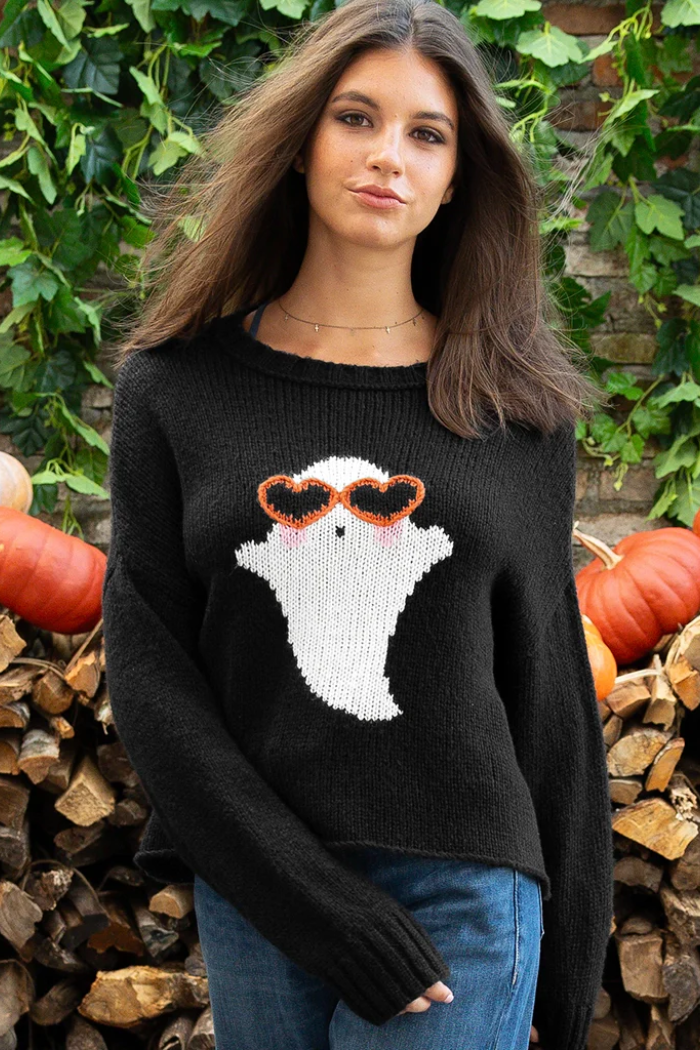 Cute with a spooky twist — the SWEET GHOST CREW features a ghost graphic at the center front, with heart-shaped sunglasses detailed in embroidery for added texture and pop. Crafted in a soft chunky knit, this sweater is finished with a ribbed crew neckline, ribbed cuffs, and a relaxed drop-shoulder fit. A fun pick to bring a little Halloween spirit into your everyday wardrobe.