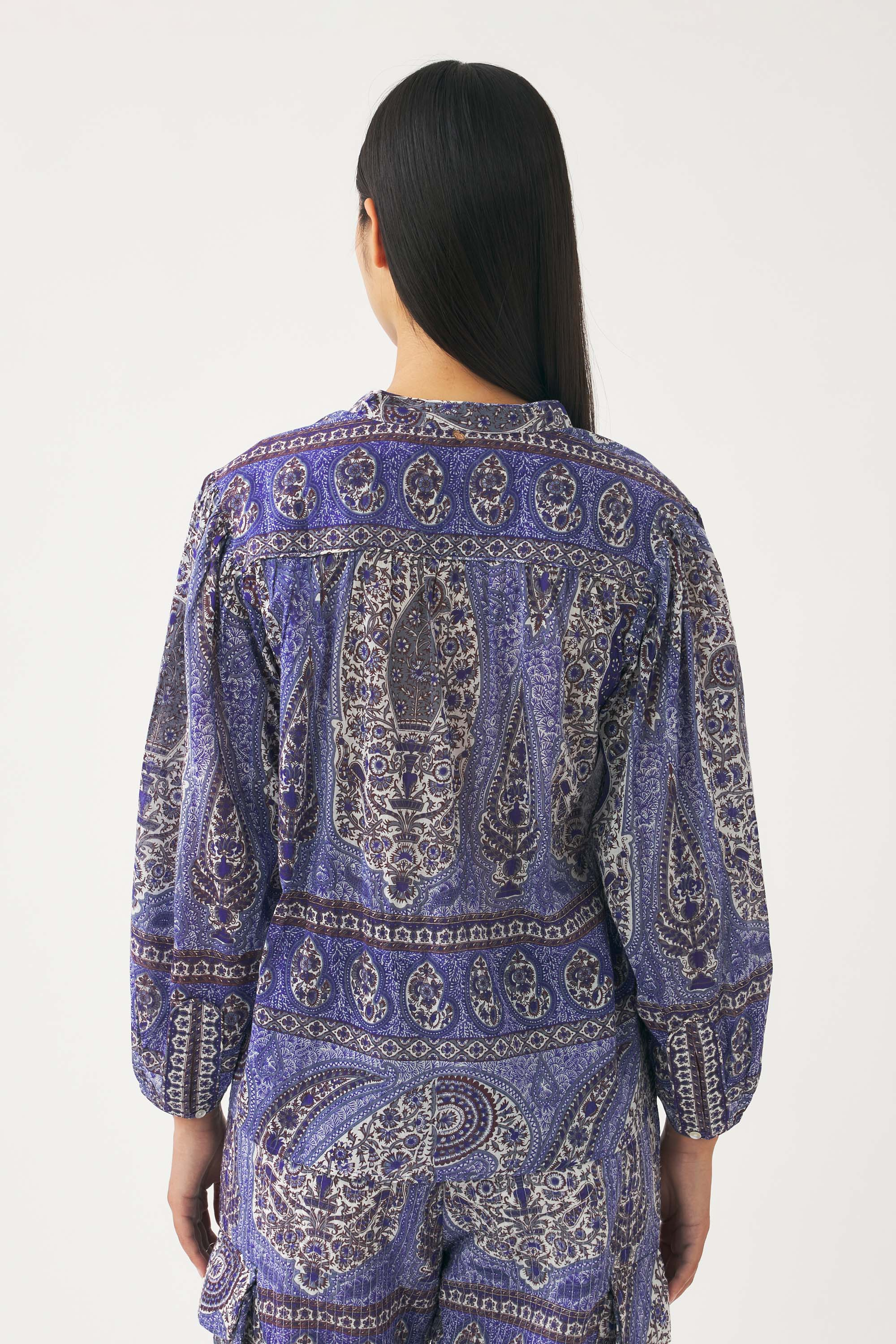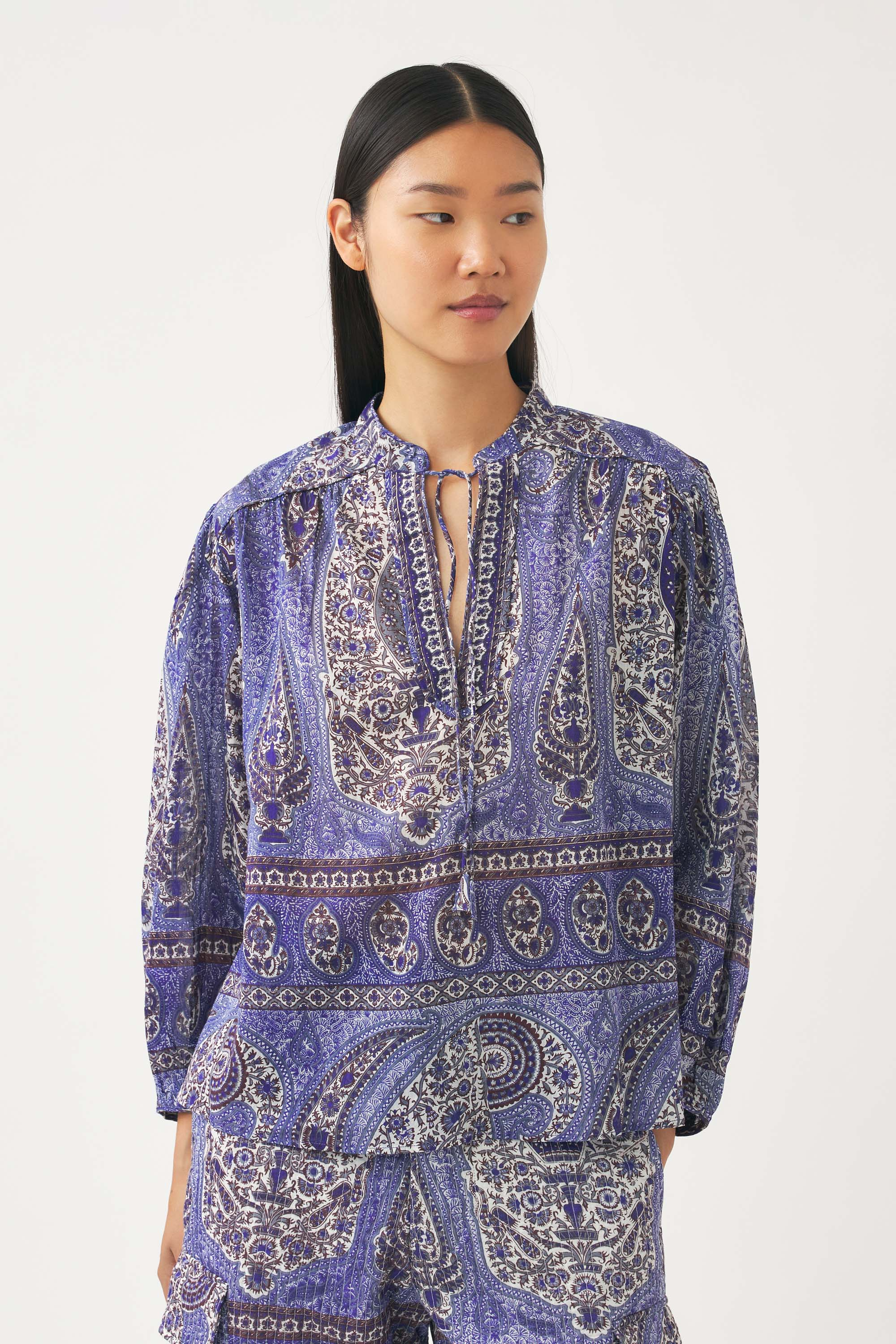 Antik Batik Cotton voile print blouse. Print designed in their Parisian studio and then hand-applied onto the fabric using a block printing technique (Indian artisan technique). Cotton ties. Wrists fastened with a mother-of-pearl button.