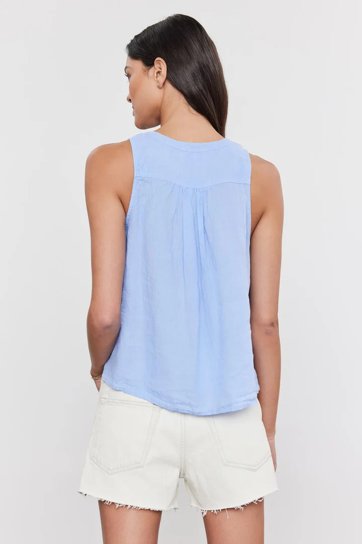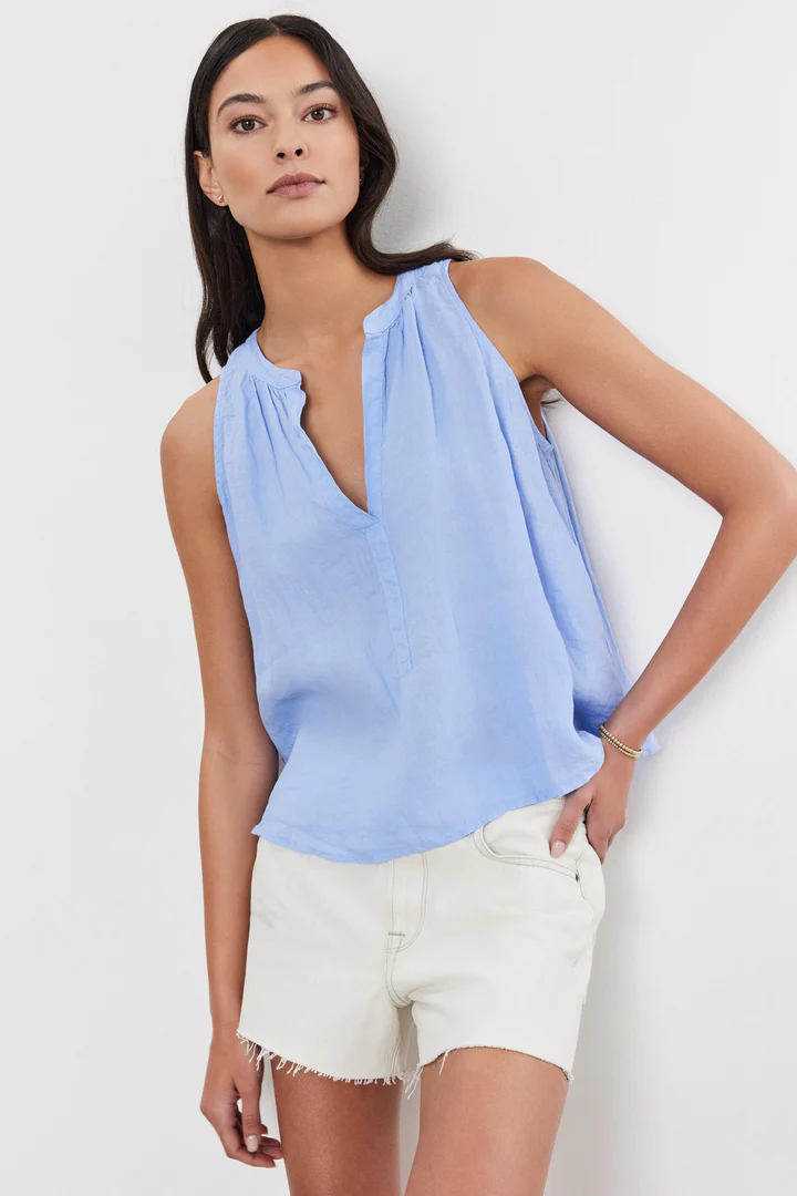 Discover ultimate comfort and style with the Velvet by Graham & Spencer Tacy 06 Sleeveless Woven Linen Top. This top features a flattering v-line and shirred details on the rear, giving it a laid-back feel that is perfect for any occasion. Made from high-quality woven linen, it provides comfort and breathability for all-day wear.